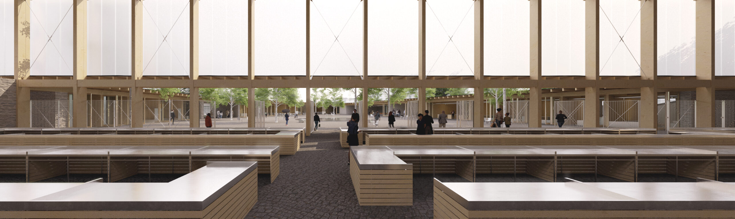 Our proposal envisions the new municipal market as an open, welcoming public ground — a perimeter of lightweight structures that frames a central plaza, creating a continuous space for commerce, gathering, and everyday life. Stone, timber, and soft planting reinterpret the local vernacular through contemporary simplicity. The design blurs the boundary between inside and outside, allowing the market to operate as an urban living room: porous, accessible, and active throughout the day.