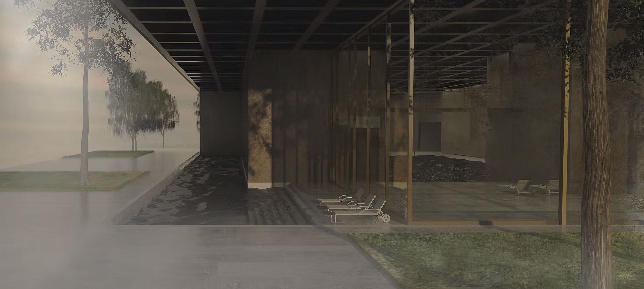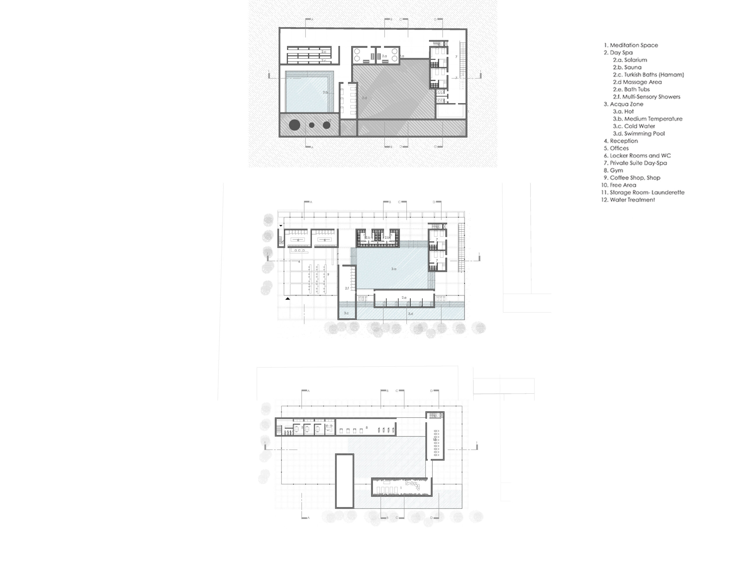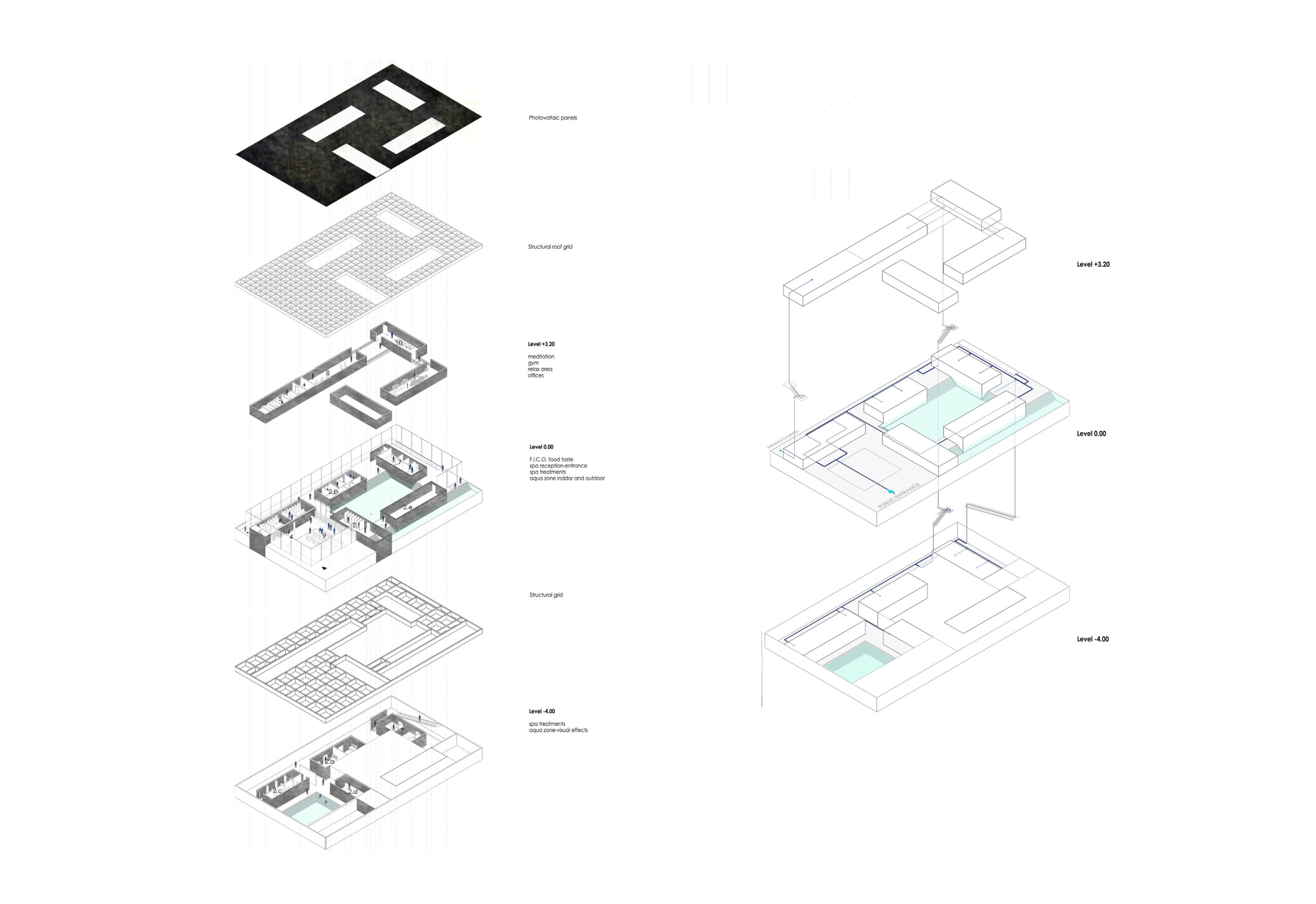 The architectural design is based on the solid volumes and the way they relate to the water. The way they are arranged is inspired from the typology of Bologna’s medieval city, the atrium, which was the core of the building and in which every space was in close relationship to it, in which our project the atrium is translated as the main aqua zone, in which the solid volumes surround it. In addition to that, we were interested in creating atmospheric spaces having in mind light and shadow contrasts. This was achieved in two ways: firstly by arranging the volumes in such way that we controlled the amount of light entering and secondly by the choice of the material used for the volumes, which was Barites (also known as Bologna stone). This is a local material plentiful in the area and it is naturally found in hot spring deposits. We decided to mix it with granite, which is a very famous material used in spa relaxation areas. The combination of these two factors gave a cave-like atmosphere which can be related to hot spring caves and inspires the human being in initiation of relaxation and wellness.