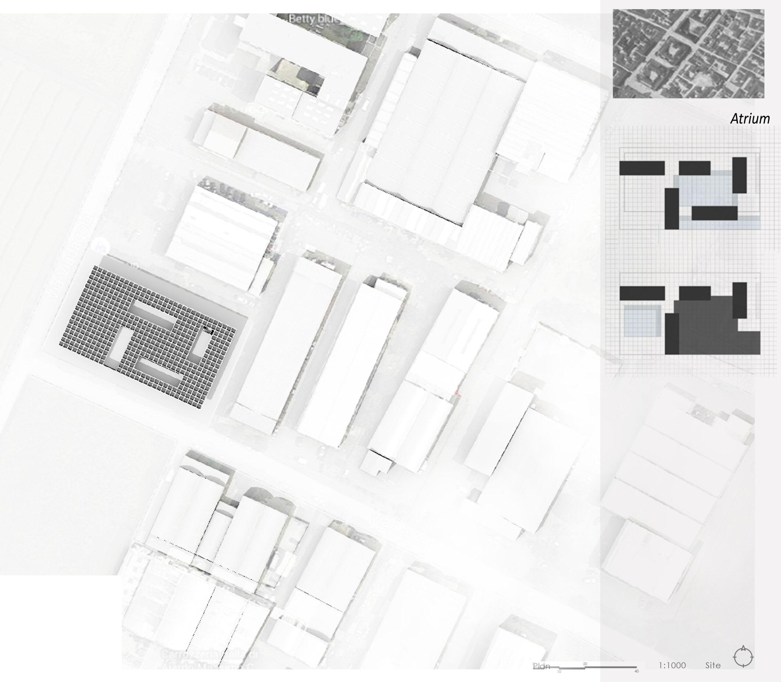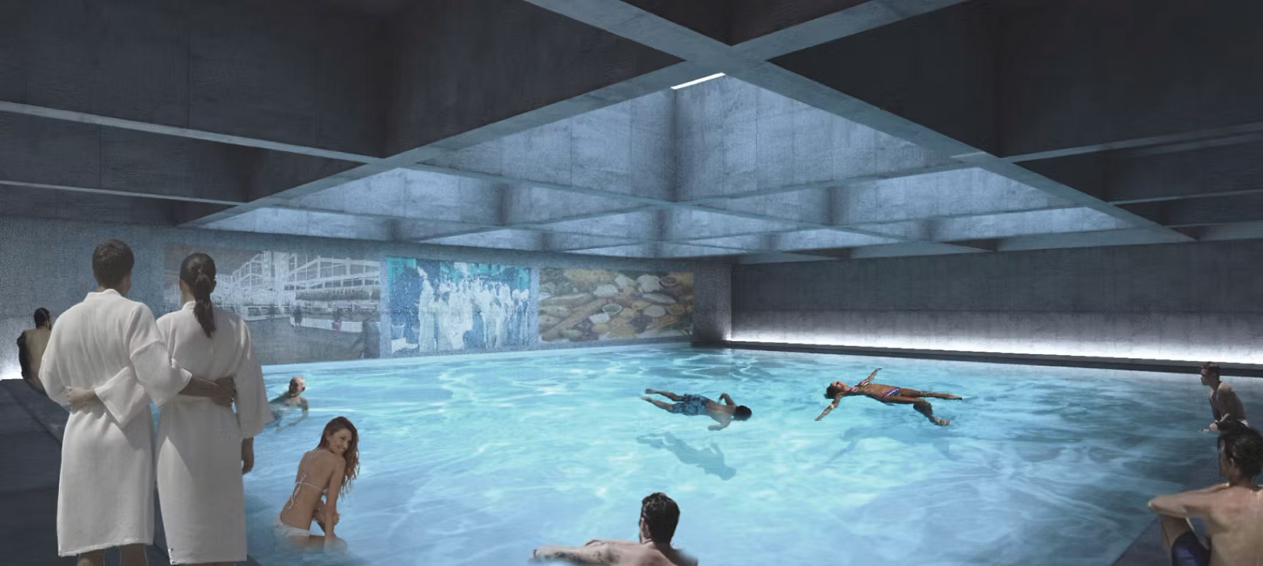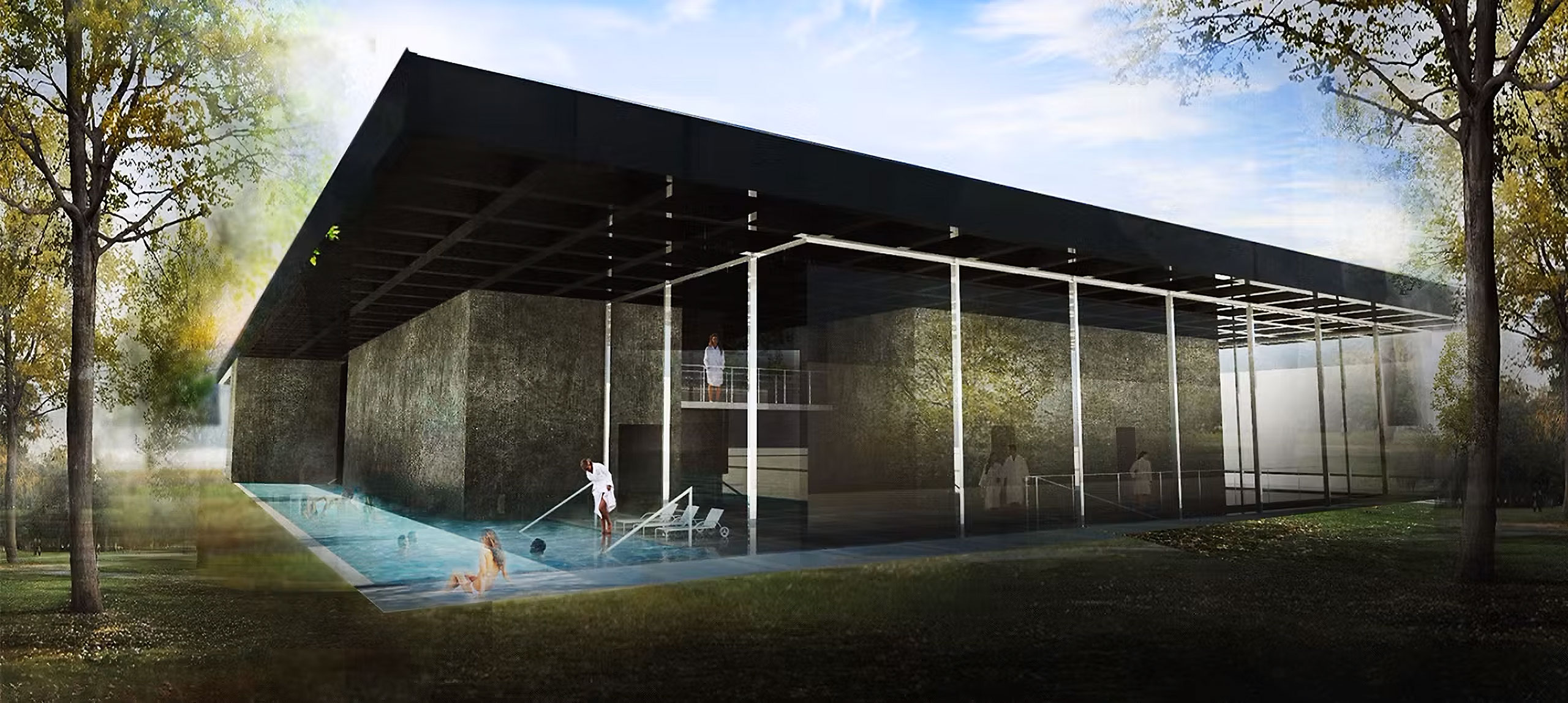 The architectural design is based on the solid volumes and the way they relate to the water. The way they are arranged is inspired from the typology of Bologna’s medieval city, the atrium, which was the core of the building and in which every space was in close relationship to it, in which our project the atrium is translated as the main aqua zone, in which the solid volumes surround it. In addition to that, we were interested in creating atmospheric spaces having in mind light and shadow contrasts. This was achieved in two ways: firstly by arranging the volumes in such way that we controlled the amount of light entering and secondly by the choice of the material used for the volumes, which was Barites (also known as Bologna stone). This is a local material plentiful in the area and it is naturally found in hot spring deposits. We decided to mix it with granite, which is a very famous material used in spa relaxation areas. The combination of these two factors gave a cave-like atmosphere which can be related to hot spring caves and inspires the human being in initiation of relaxation and wellness.