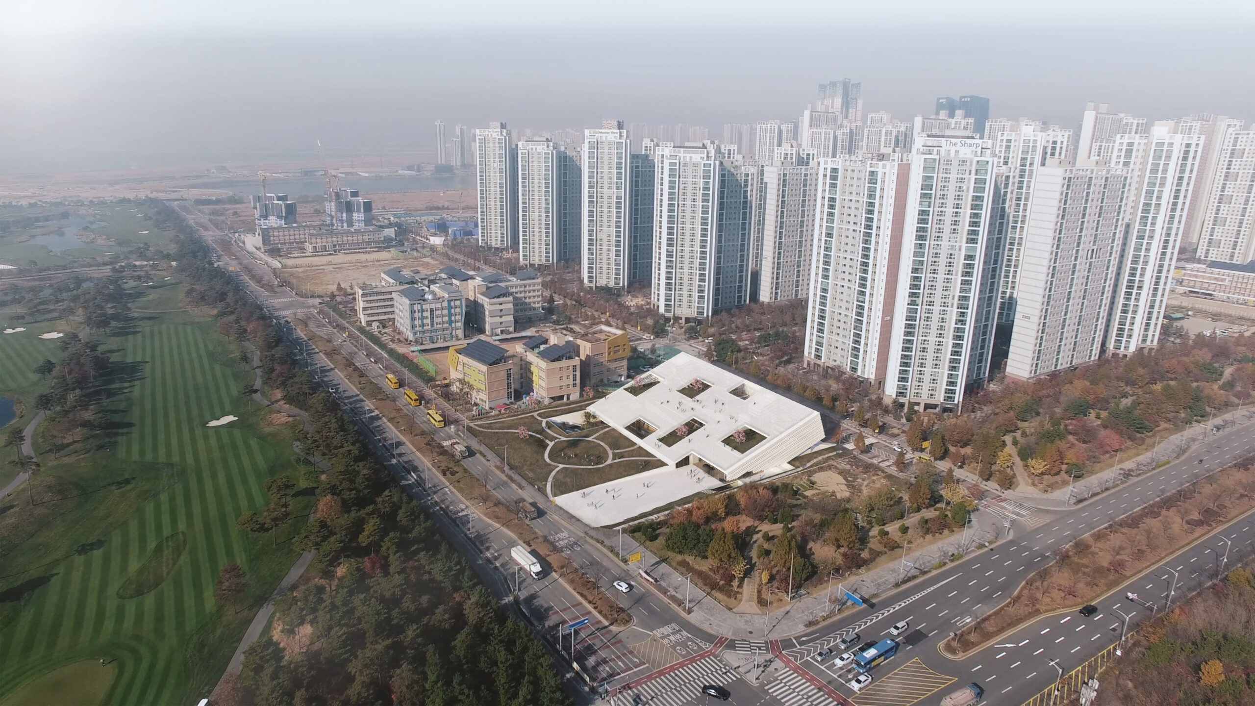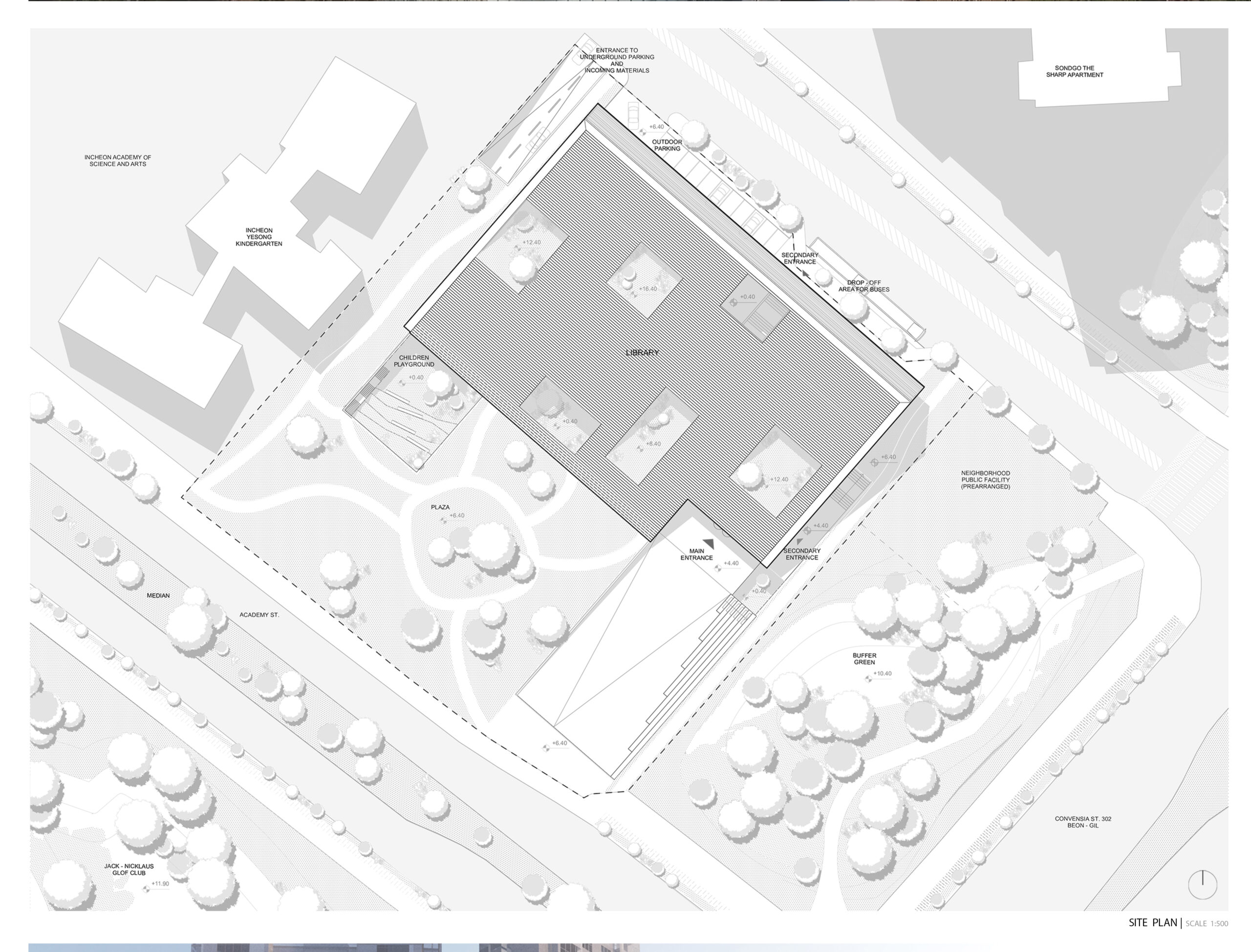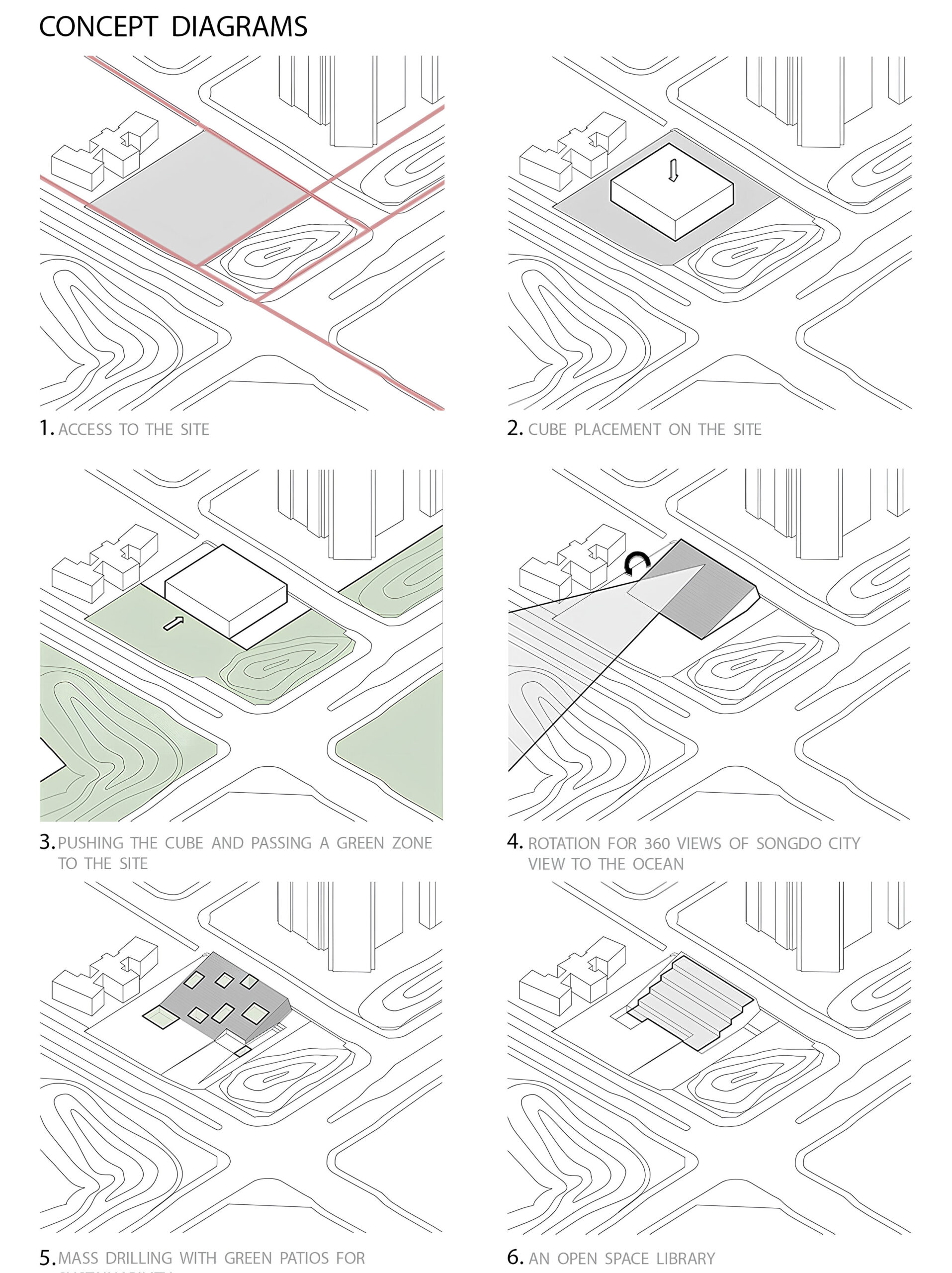 Local architecture, urban history and the future perspective are put together under this structure serving as a platform for knowledge transmission and social engagement. Its welcoming shape attracts the visitor to be part of a broad-spectrum discussion that concerns the Songdo community and beyond. With the building placed in the north and its main facade turned towards the outstanding south view of the Golf Club and the ocean ahead, the landscape seems to enter the site forming a park that actively engages with the urban environment around. Pedestrians are thus smoothly introduced to the library space through flowing routes that end up in the center of the site, beside the library’s main entrance.