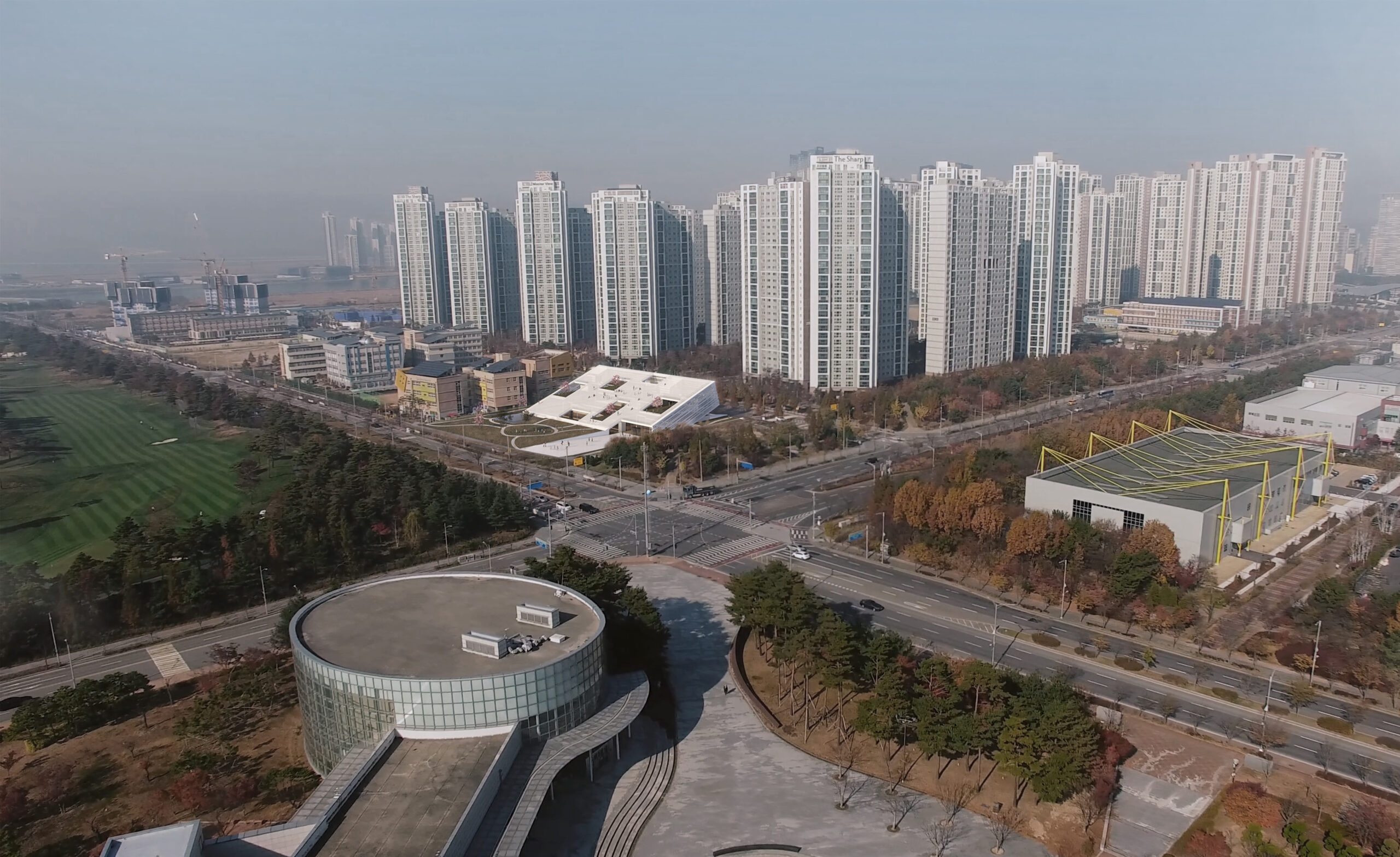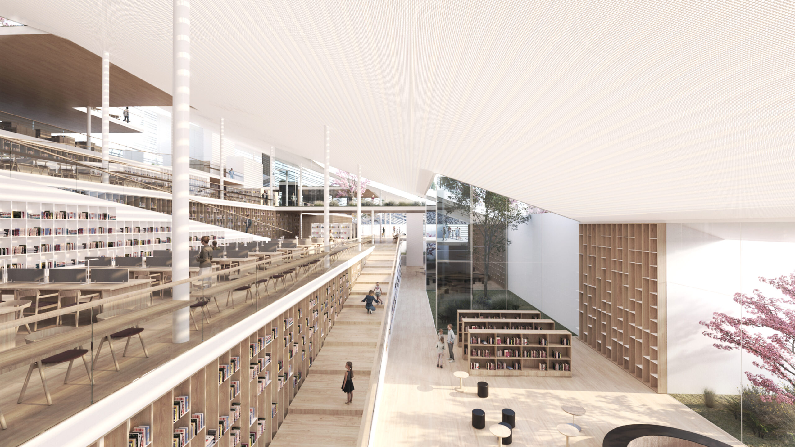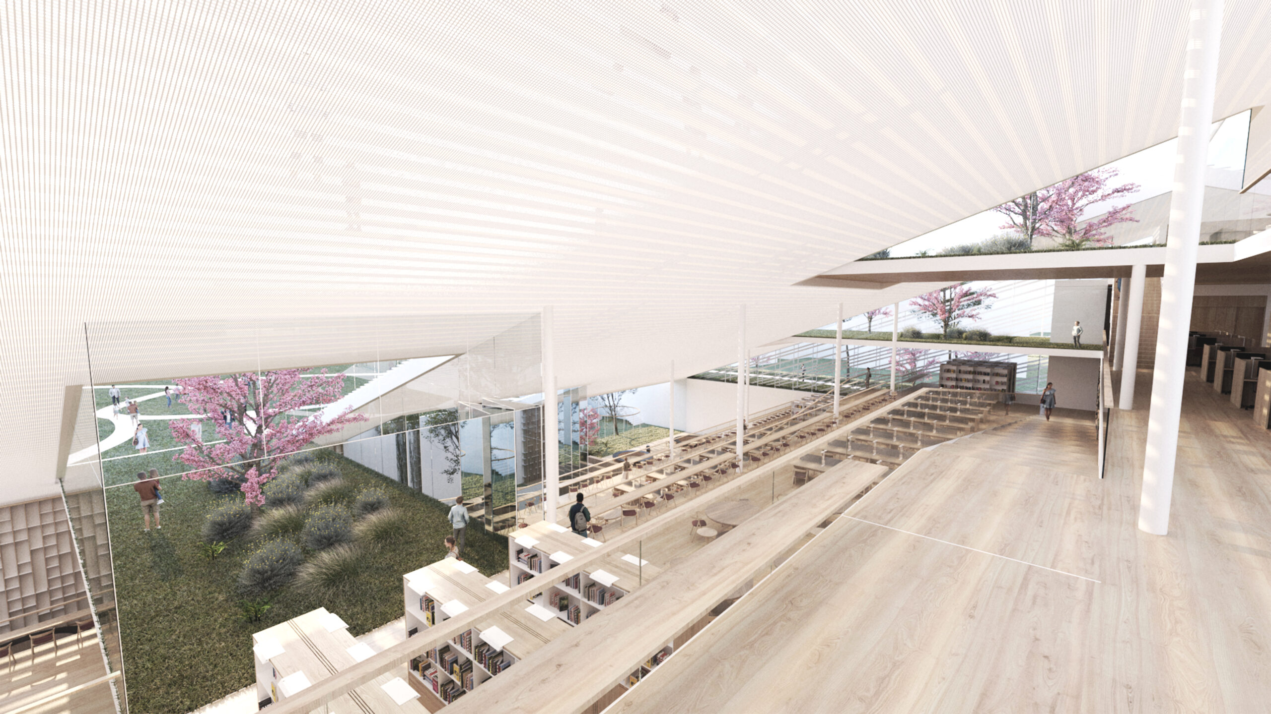 Local architecture, urban history and the future perspective are put together under this structure serving as a platform for knowledge transmission and social engagement. Its welcoming shape attracts the visitor to be part of a broad-spectrum discussion that concerns the Songdo community and beyond. With the building placed in the north and its main facade turned towards the outstanding south view of the Golf Club and the ocean ahead, the landscape seems to enter the site forming a park that actively engages with the urban environment around. Pedestrians are thus smoothly introduced to the library space through flowing routes that end up in the center of the site, beside the library’s main entrance.