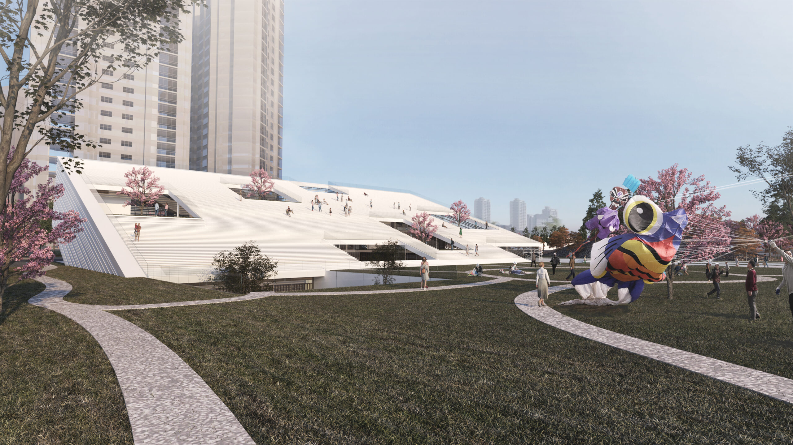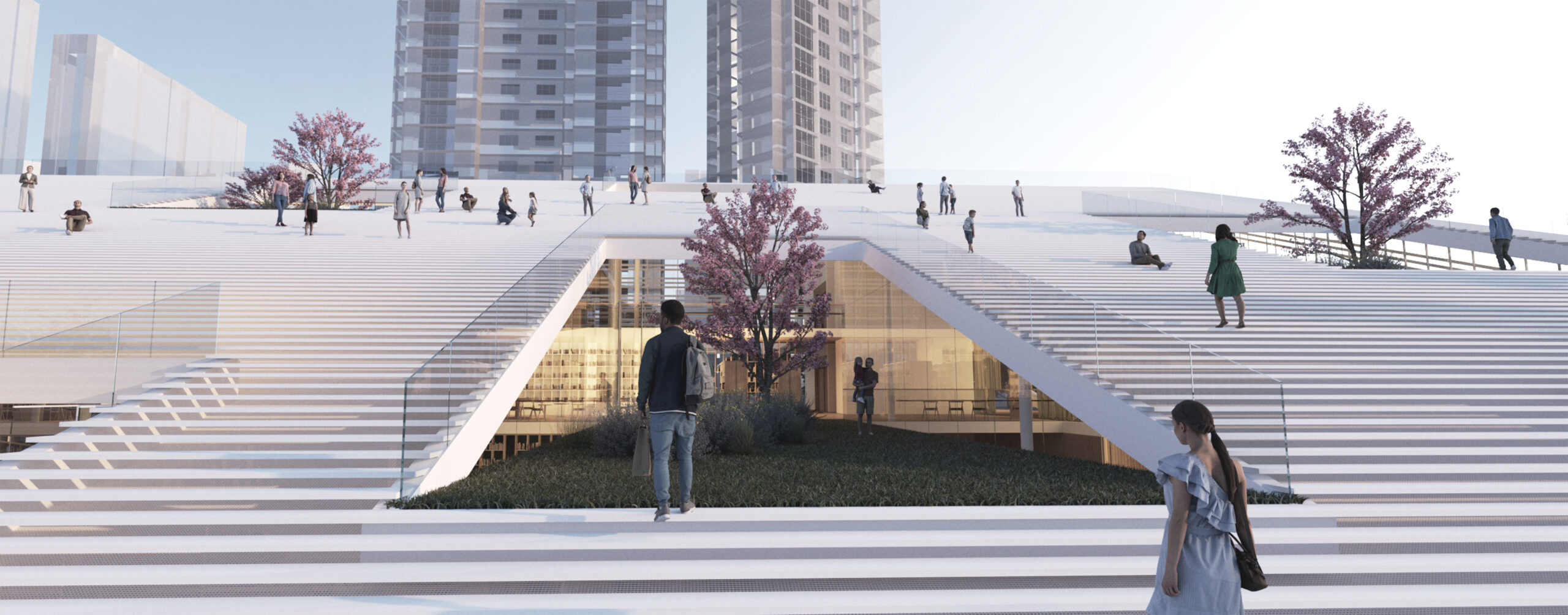 The Library of Songdo International City is envisioned as a building that would embody the publicness of knowledge in a city that claims to serve as an international paradigm. Bold and clear, our architectural concept is this of a half buried rectangular parallelepiped, inclined so that its main facade forms a large amphitheatrical stage. Its sculptural approach, instantly placing it among the highly symbolic buildings of the area, allows the architectural form to stand in the intersection of art and philosophy. Reflecting our contextual interpretation of a public space dedicated to knowledge and progress, this stair-shaped form aims to function as a cultural landmark.