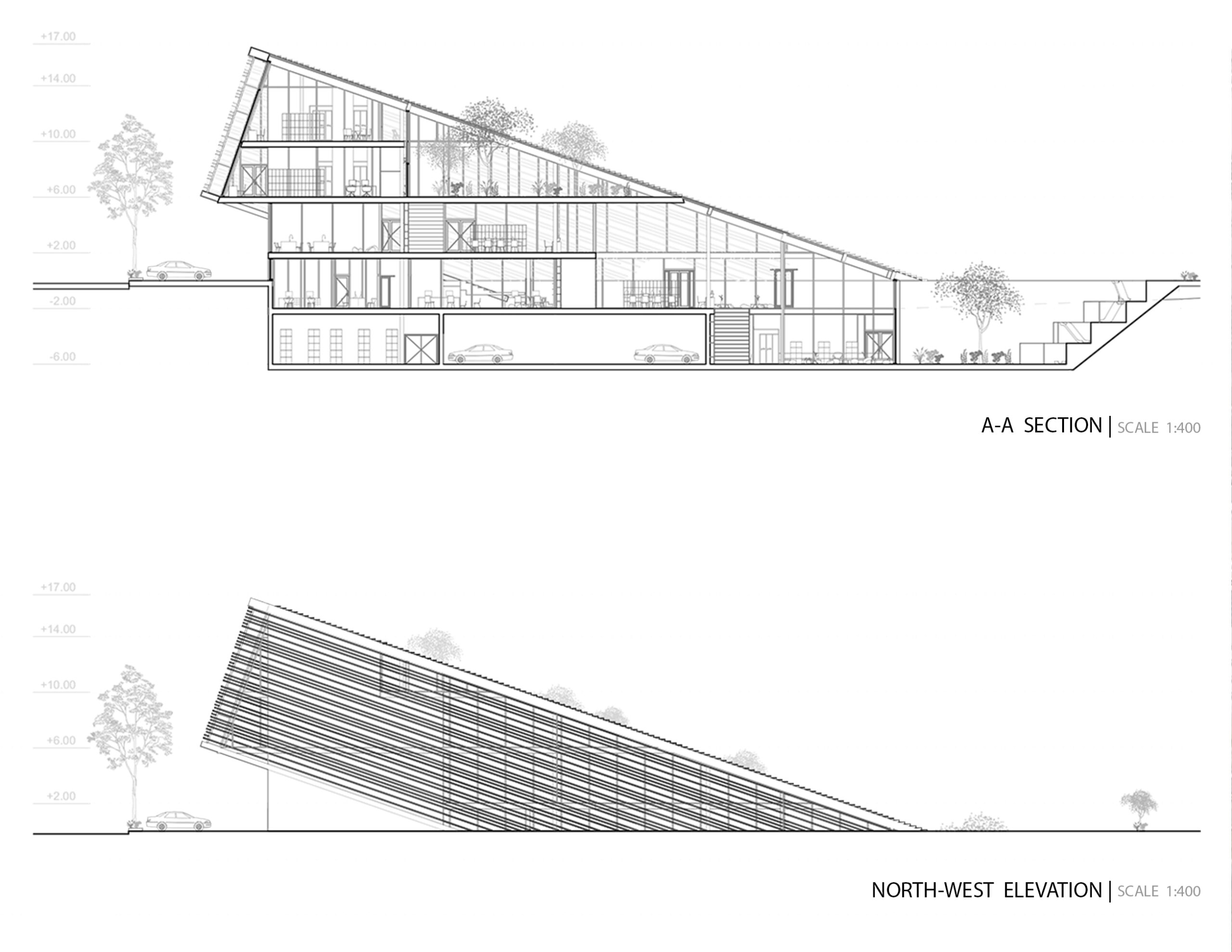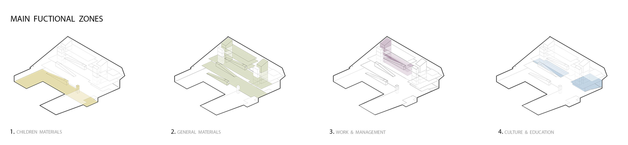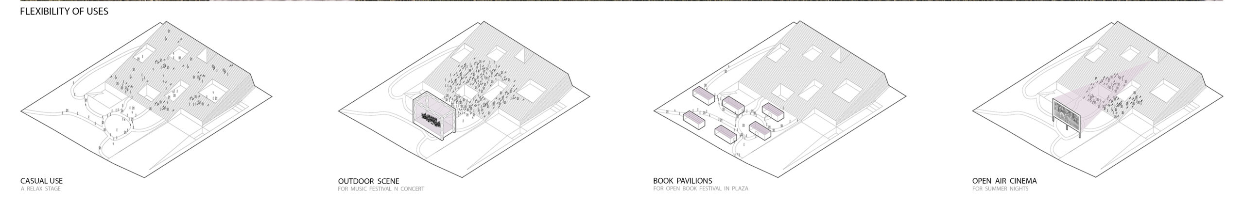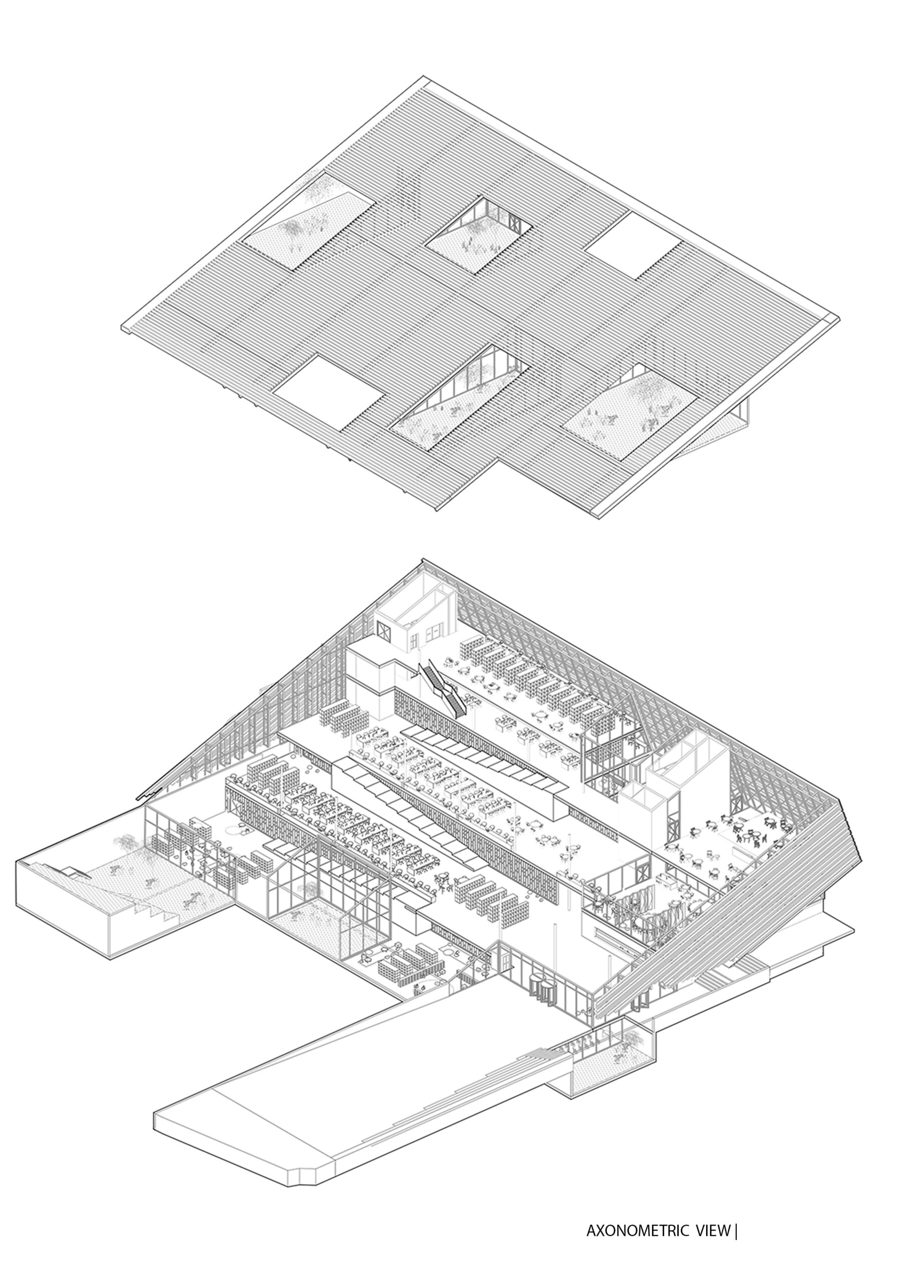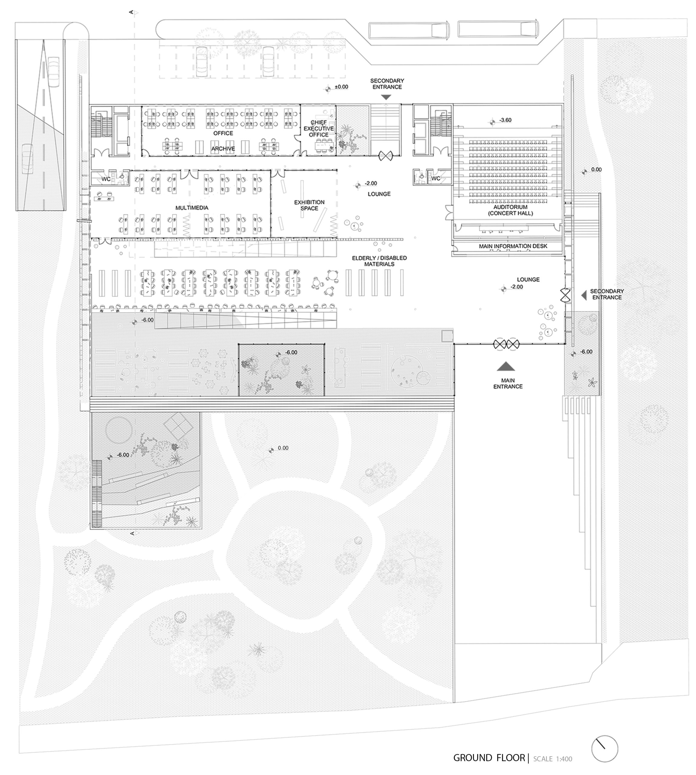 Entering the building from the main entrance, visitors will find themselves facing all levels of possible movement within the library. The space unfolds its qualities stepwise starting from level -6 of the arrangement, where the children area and playground are placed, until the highest level of the cafe and study hall. One single ramp twists through all four levels of the arrangement, maintaining the cohesive meaning of the design. Atriums are situated at each level serving the needs of lighting, ventilation as well as visual and physical release. Care has also been taken so that all library spaces are accessible to the disabled.