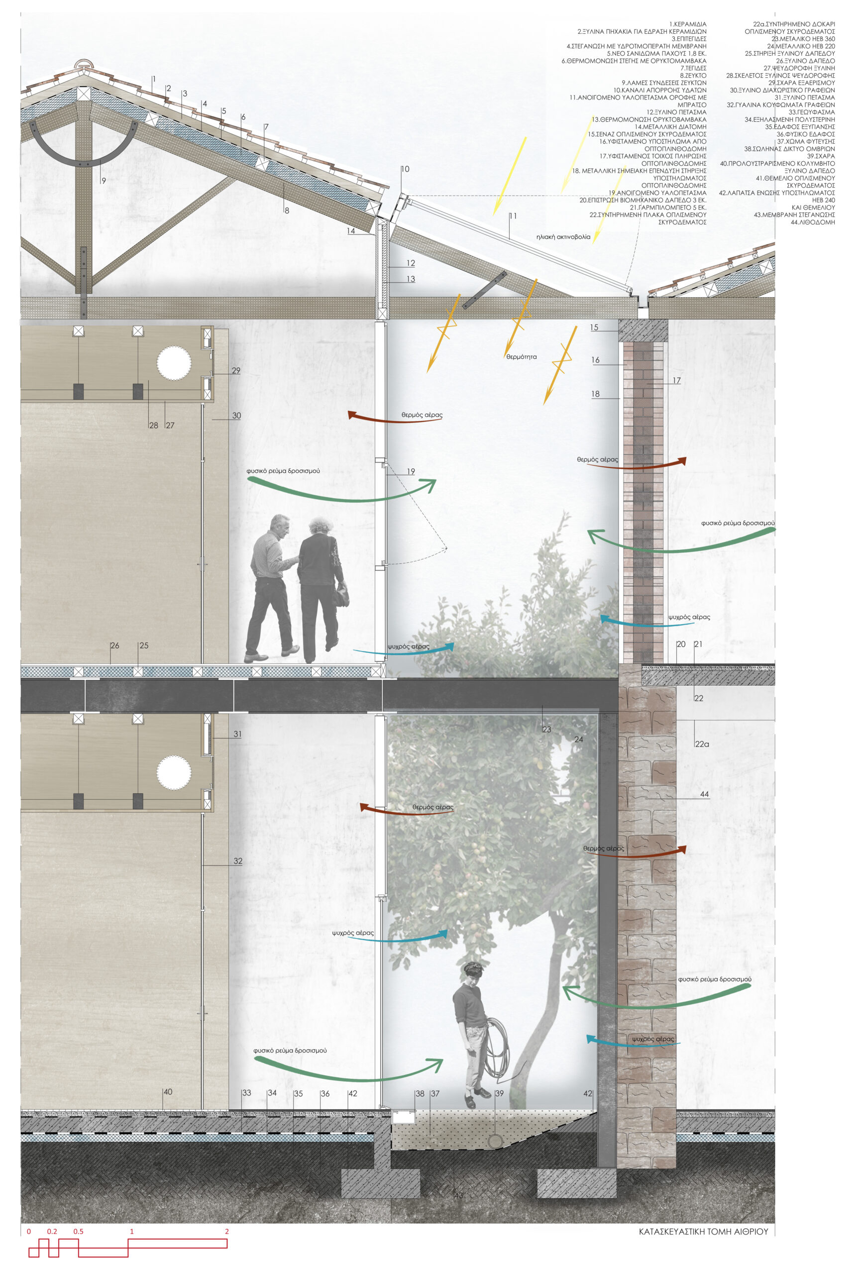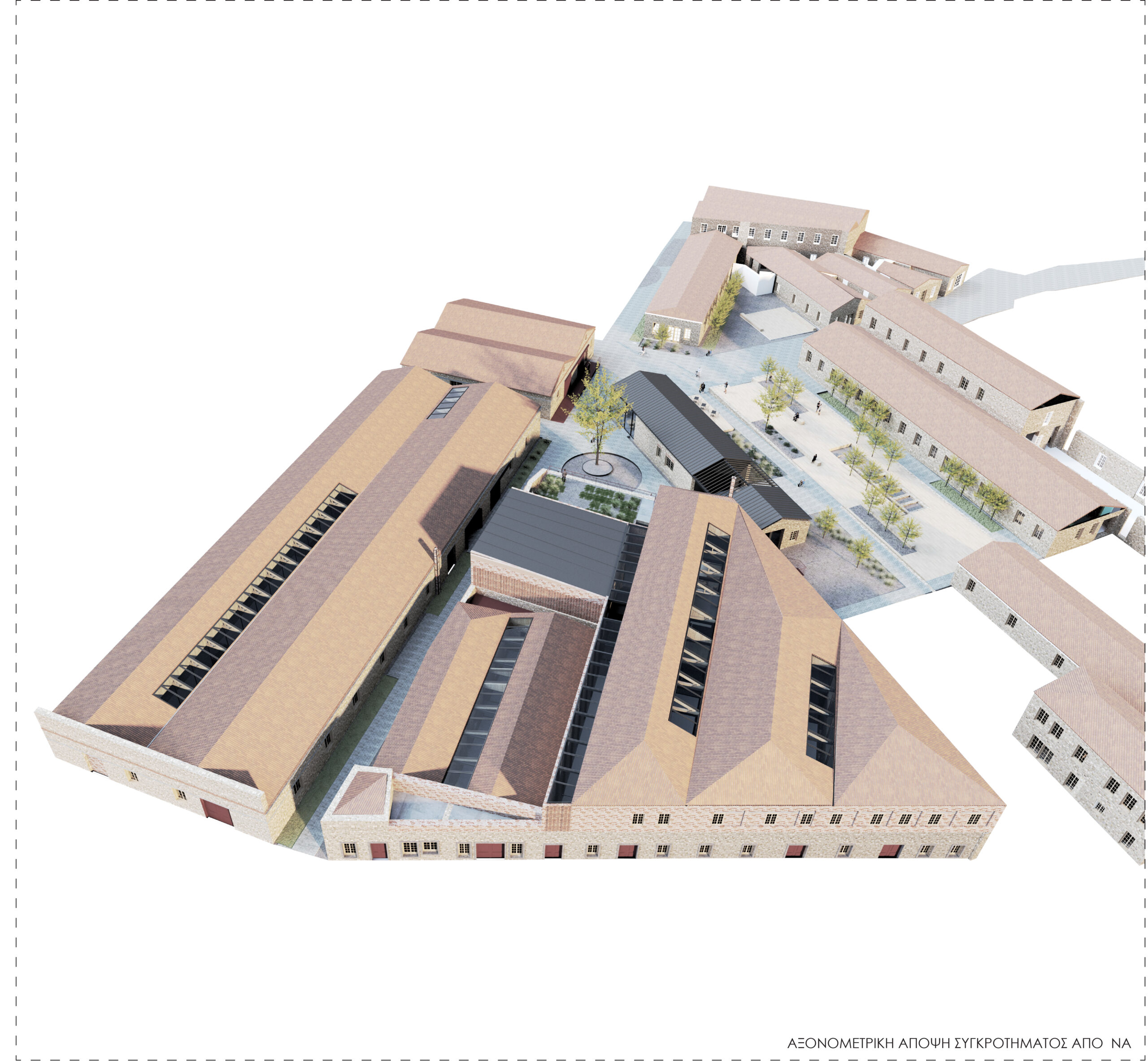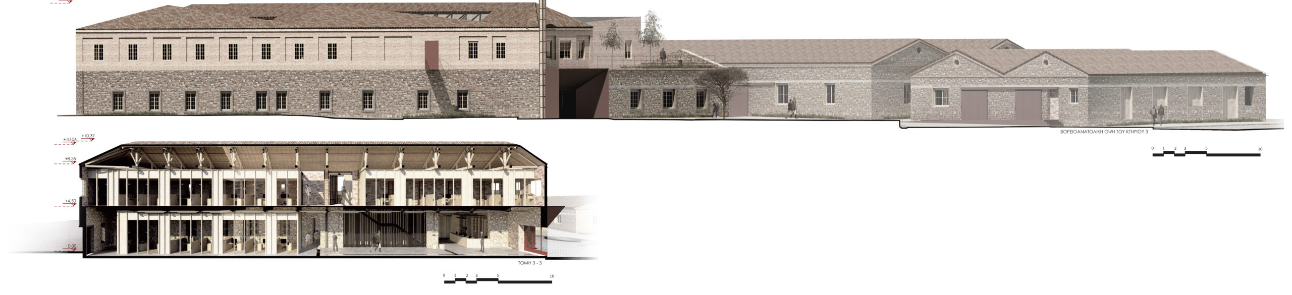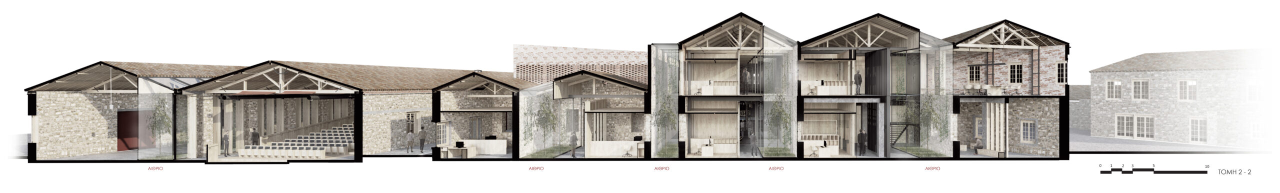 The architectural idea is the introduction of a linear system of atriums that run through all the functional units of the new uses and organize the movement, light and air inside the complex. Contrary to the perception of the building as a hermetically sealed box where mechanical systems take on the role of creating the indoor climate, we propose a method that is in a dynamic relationship with the environment by exchanging heat with the environment through the opening glass surfaces of atriums in two basic operating scenarios.