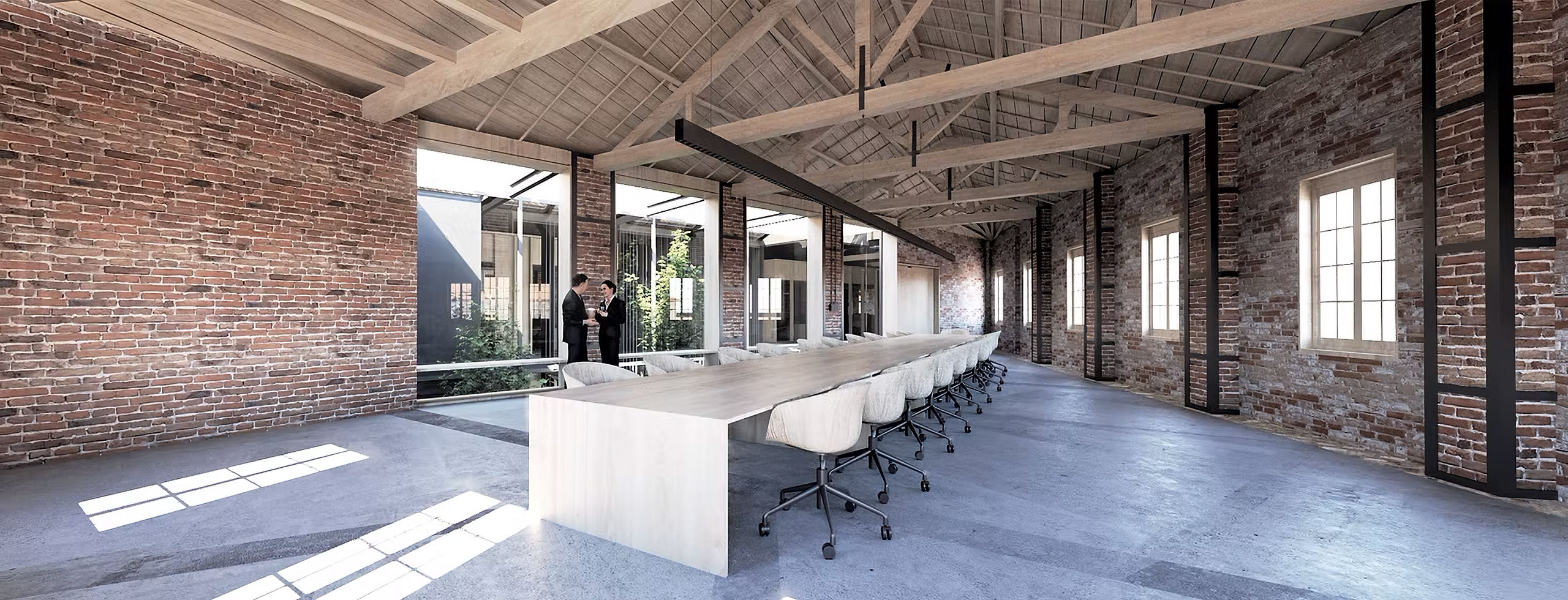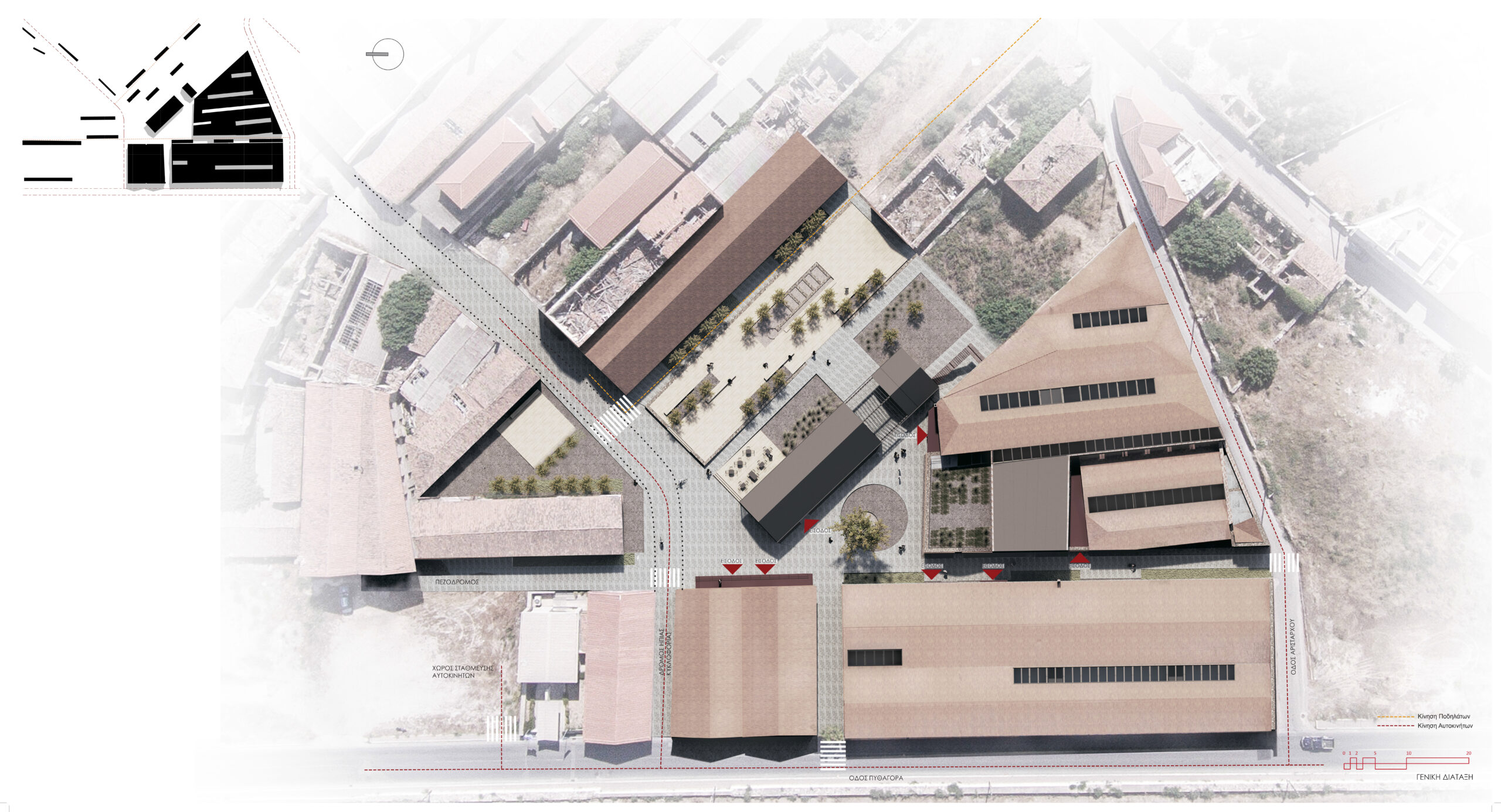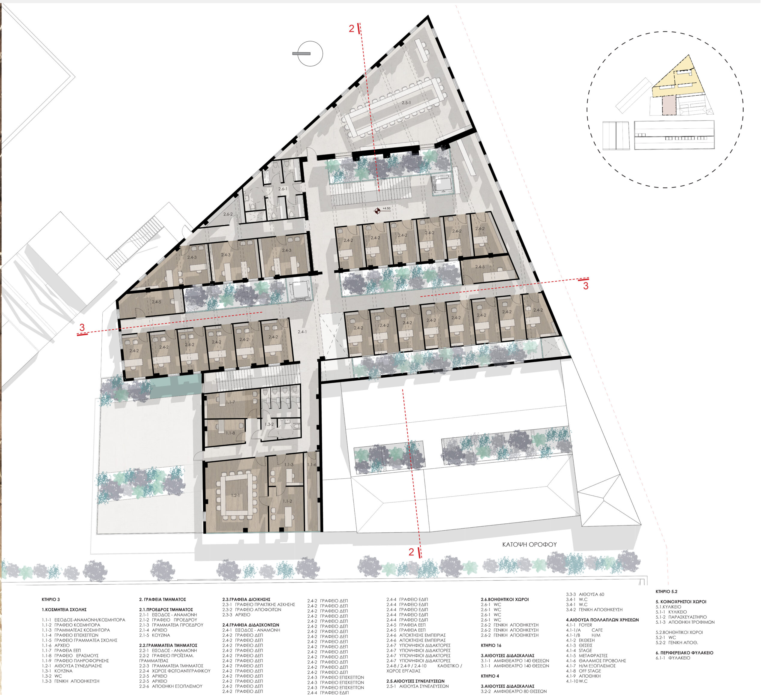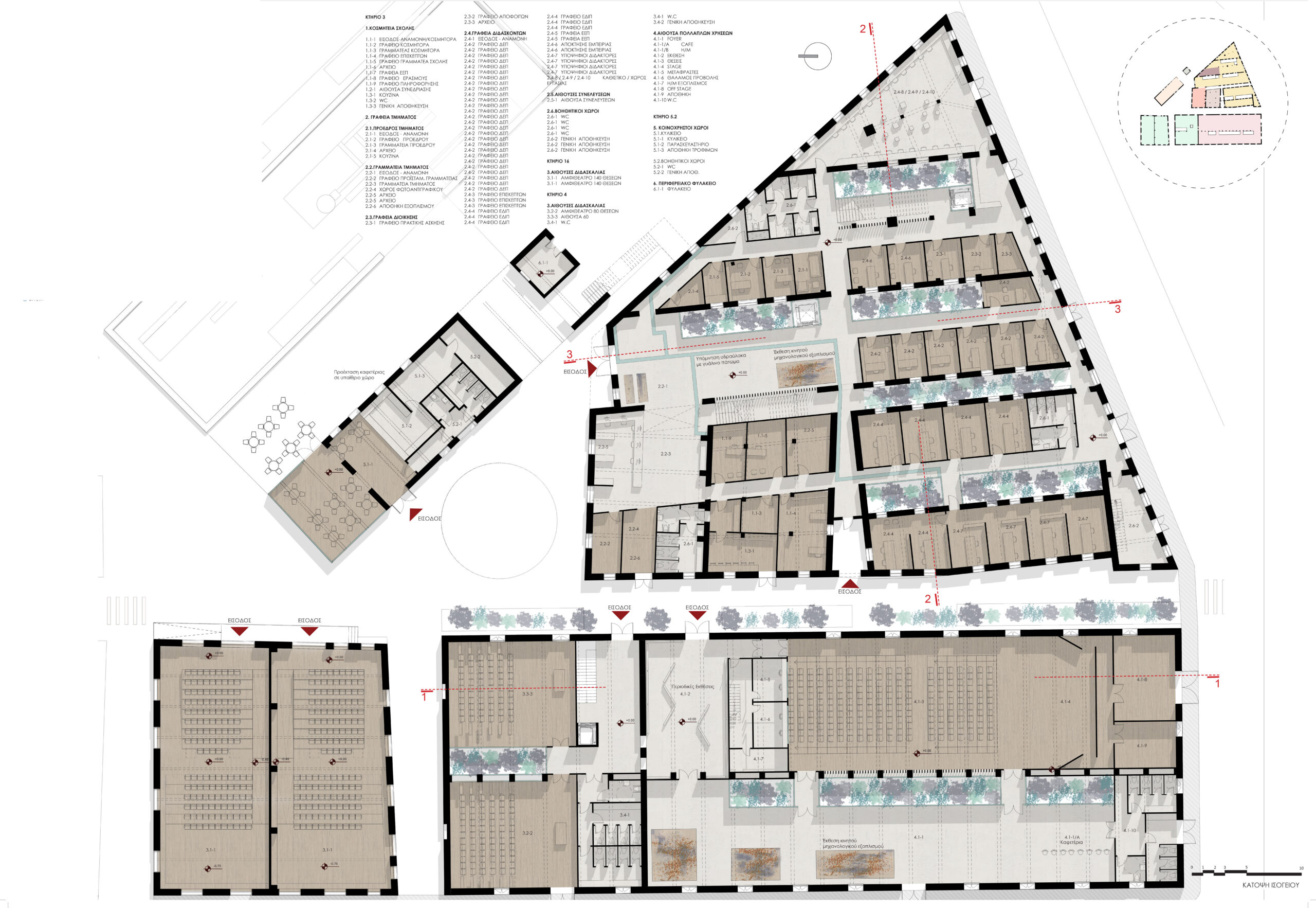 The architectural idea is the introduction of a linear system of atriums that run through all the functional units of the new uses and organize the movement, light and air inside the complex. Contrary to the perception of the building as a hermetically sealed box where mechanical systems take on the role of creating the indoor climate, we propose a method that is in a dynamic relationship with the environment by exchanging heat with the environment through the opening glass surfaces of atriums in two basic operating scenarios.