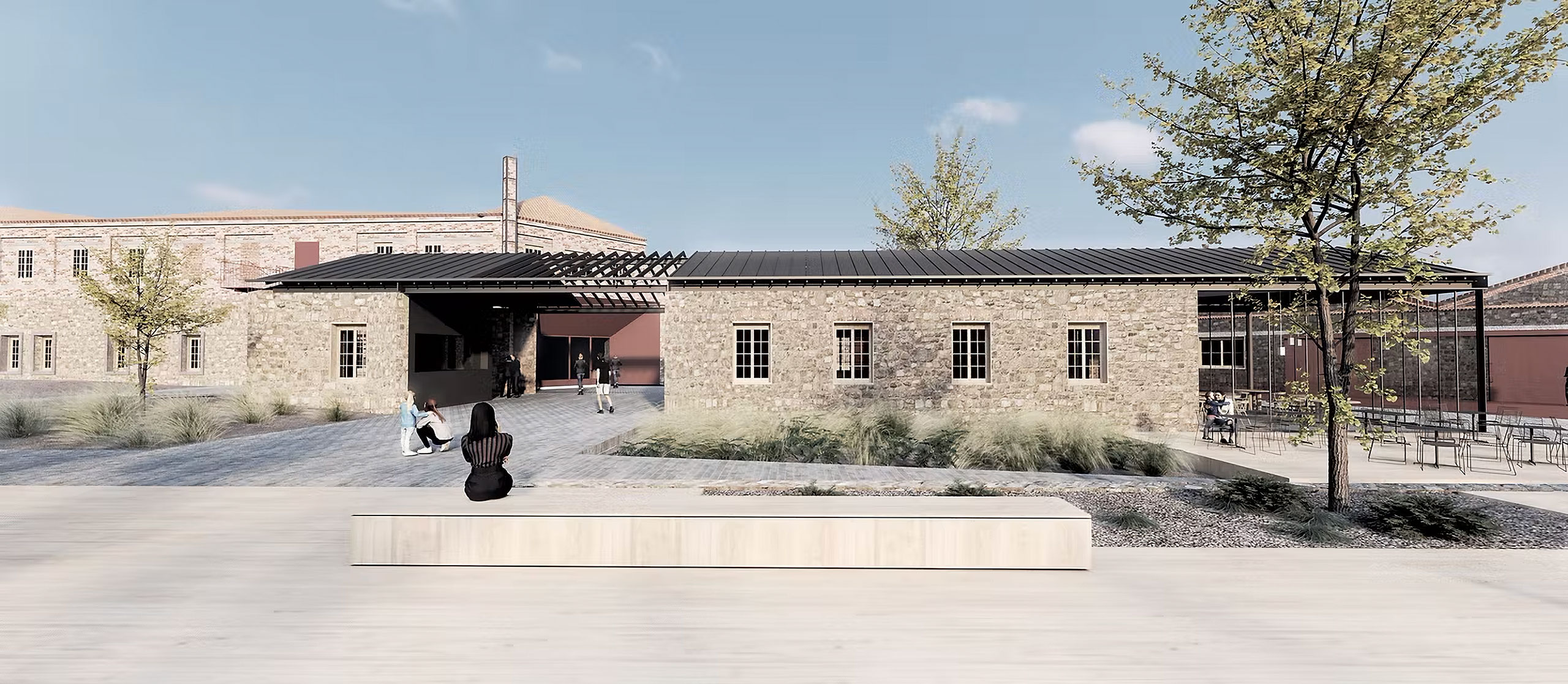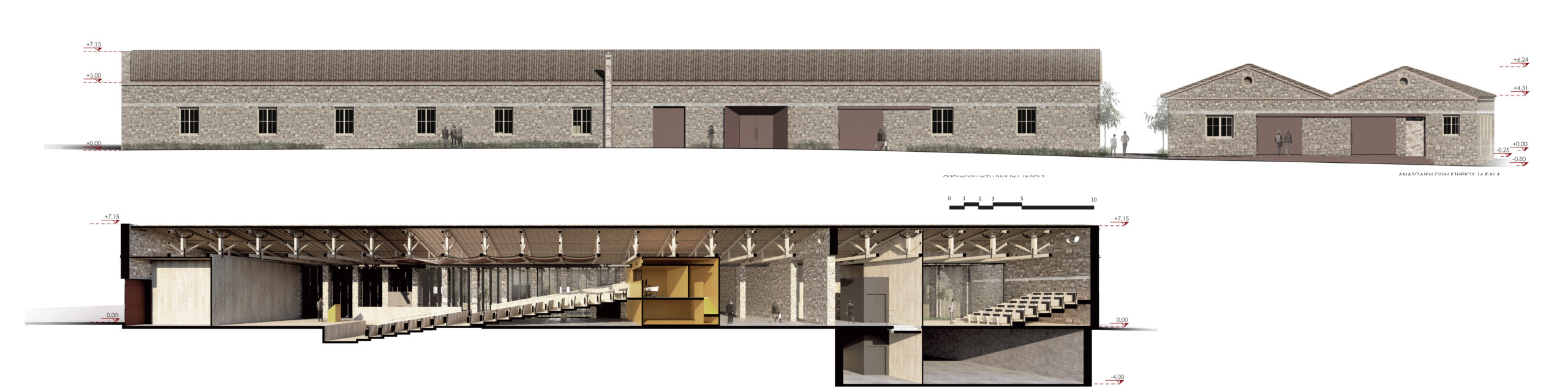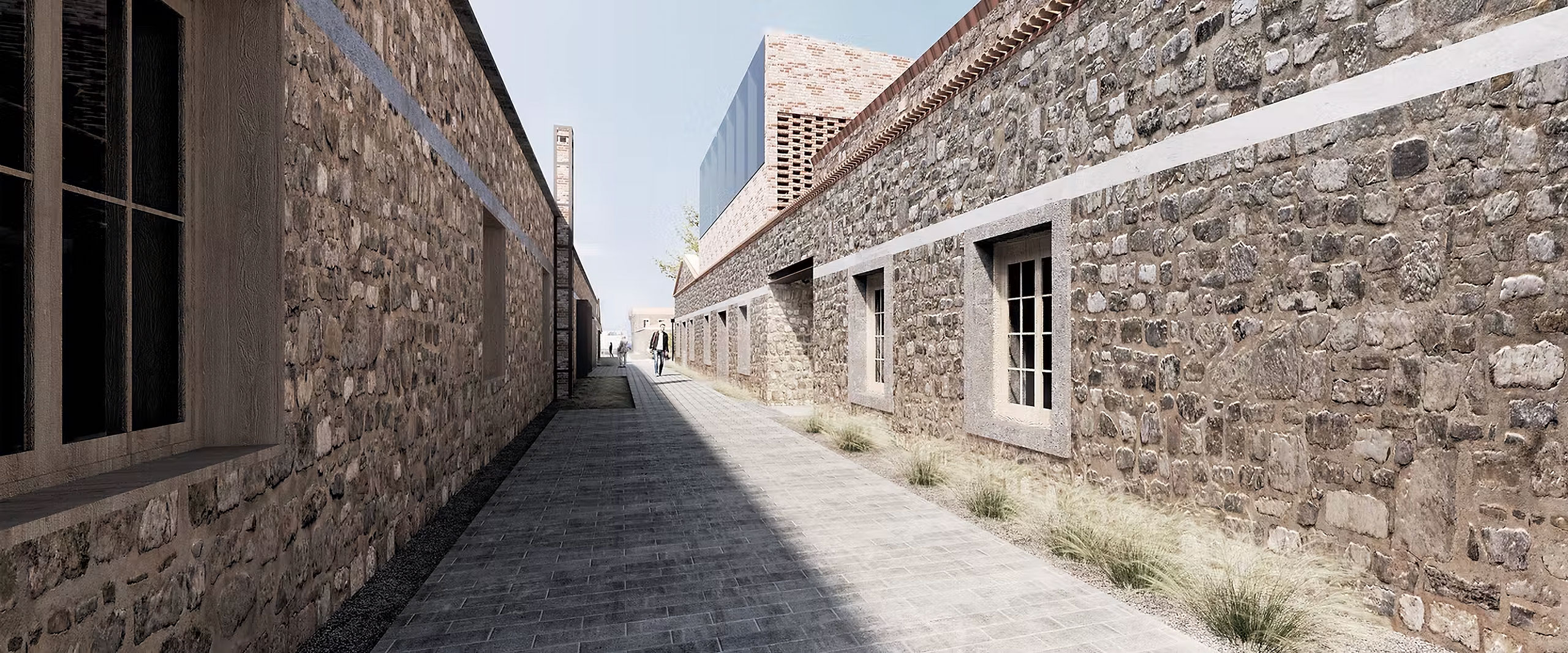The same linear engravings continue in the open space as movement and planting zones following the axes of the buildings and organizing a secondary reading system of the space. The sub-sections of the building program are included in appropriate sections to enhance the linear character of the original buildings and we carefully and economically introduce new elements to mark either the entry points or the locations of damaged structural elements. The functional units are placed within independent parts of the evolutionary prosthetic logic of the complex which creates a movements along the long sides in order to intensify the intense linearity of the space. The unity of the whole complex is achieved through the open space without uniting the buildings with additional constructions that would alter the spatial autonomy of each building. The central triangular courtyard functions as the central pedestrian traffic area, as an informal center leading to all building units as well as the outdoor area on the Southwest Side of the building which has the use of the Cafe-Canteen of the site. Most of parts of a building that have fallen are reconstructed for the sake of restoring the architectural and structural unity. But some other parts are not reconstructed entirely, and instead new building structures within the preserved data. In this way the collapse part of the history of the monument is considered and create a compatible logic of redefining the architectural form with new methods compatible with the original prosthetic logic of industrial spaces.