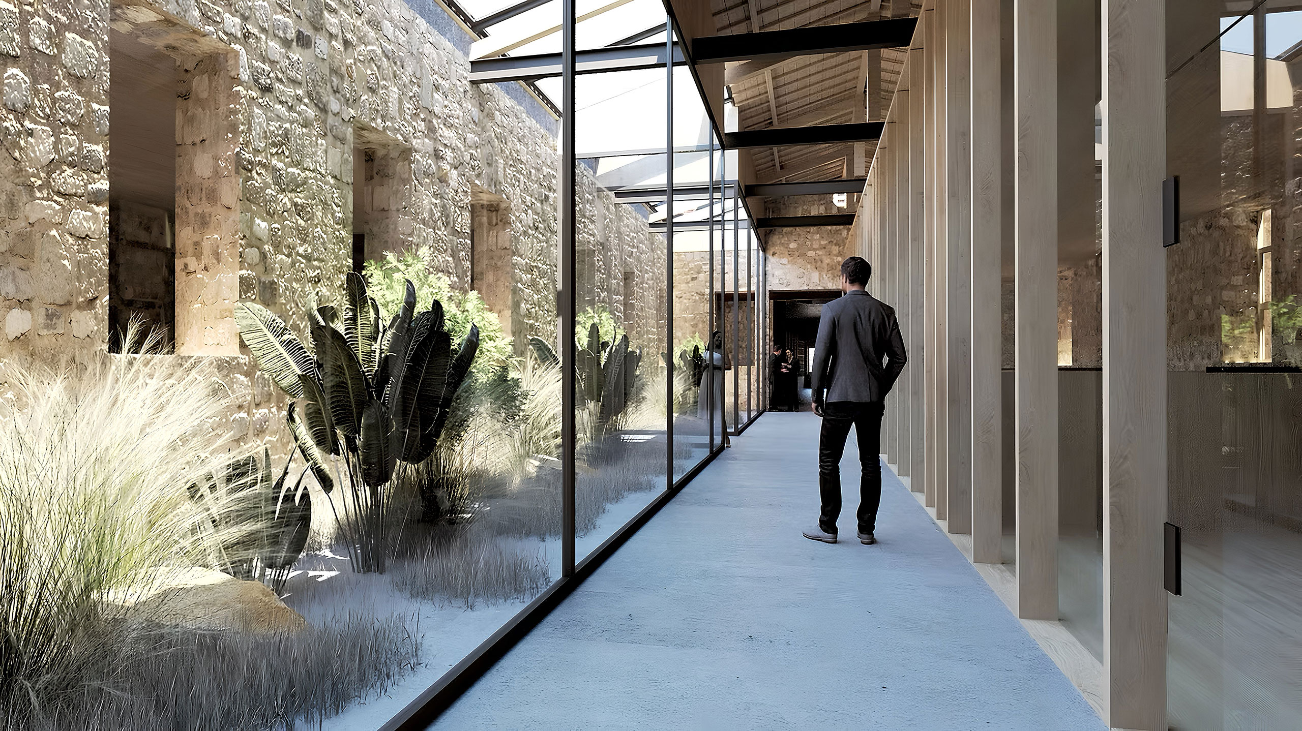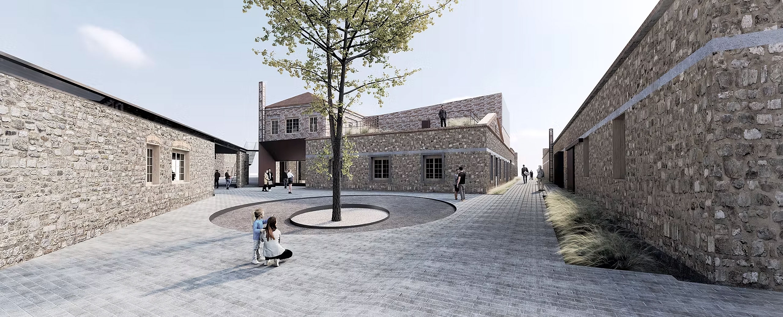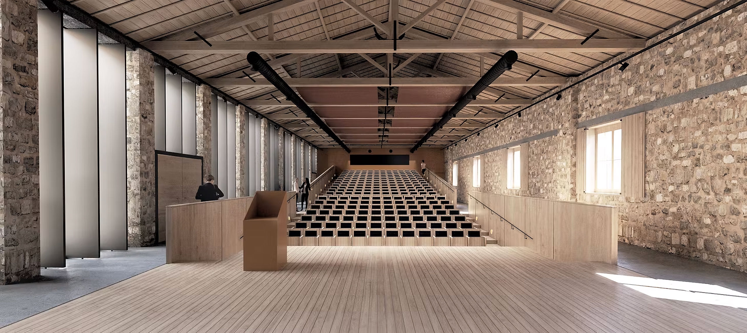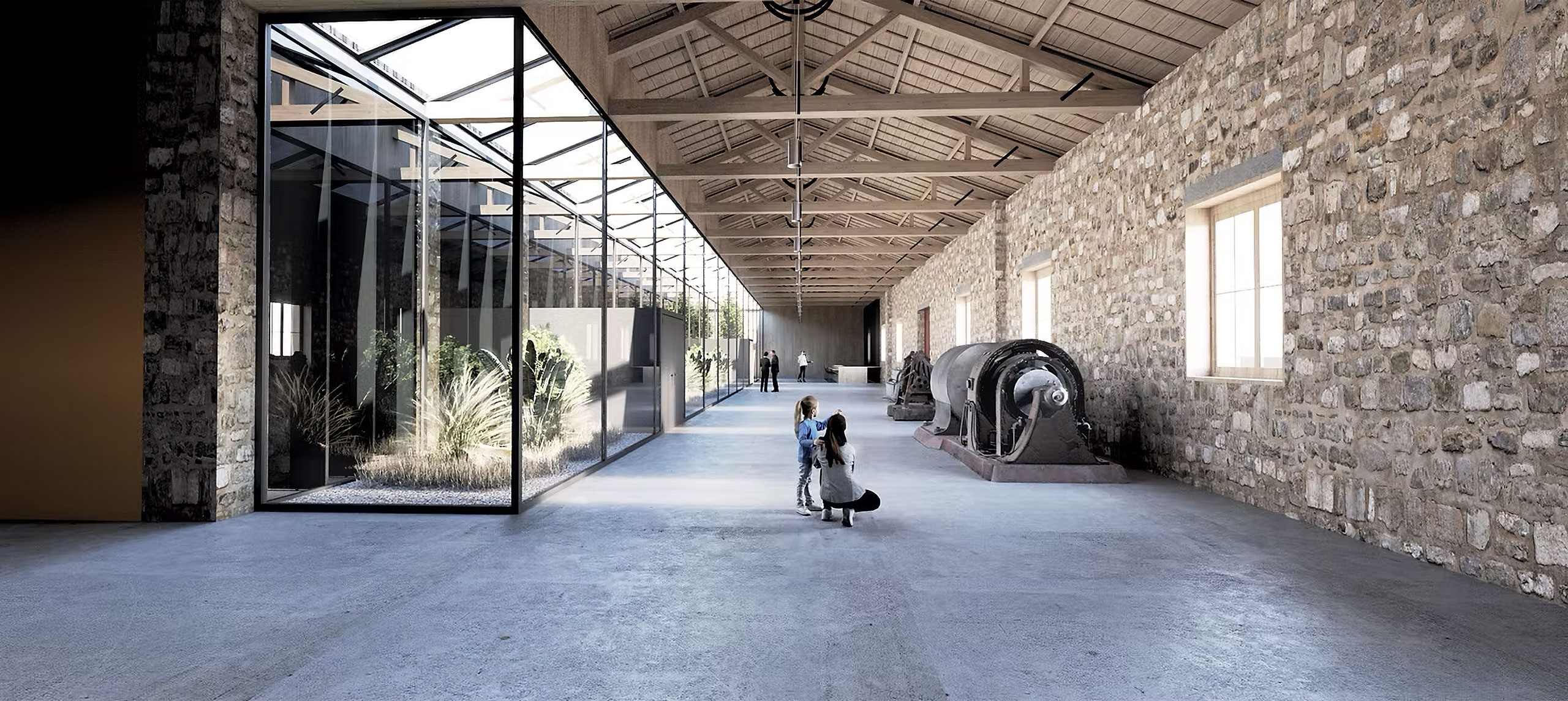 The same linear engravings continue in the open space as movement and planting zones following the axes of the buildings and organizing a secondary reading system of the space. The sub-sections of the building program are included in appropriate sections to enhance the linear character of the original buildings and we carefully and economically introduce new elements to mark either the entry points or the locations of damaged structural elements. The functional units are placed within independent parts of the evolutionary prosthetic logic of the complex which creates a movements along the long sides in order to intensify the intense linearity of the space. The unity of the whole complex is achieved through the open space without uniting the buildings with additional constructions that would alter the spatial autonomy of each building. The central triangular courtyard functions as the central pedestrian traffic area, as an informal center leading to all building units as well as the outdoor area on the Southwest Side of the building which has the use of the Cafe-Canteen of the site. Most of parts of a building that have fallen are reconstructed for the sake of restoring the architectural and structural unity. But some other parts are not reconstructed entirely, and instead new building structures within the preserved data. In this way the collapse part of the history of the monument is considered and create a compatible logic of redefining the architectural form with new methods compatible with the original prosthetic logic of industrial spaces.