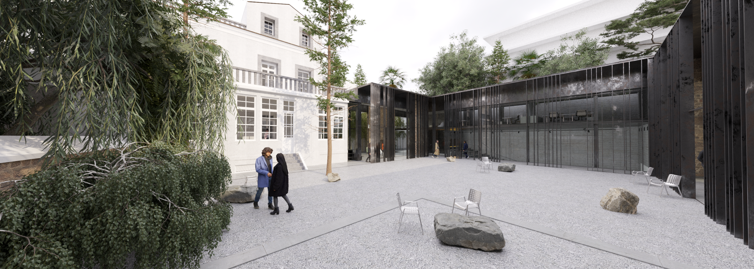 The central design concept is based on the creation of a unified, open and permeable composition that functions as a natural extension of the urban fabric. The new building is developed in a U-shaped layout around a spacious central courtyard, forming a protected yet publicly accessible core. The courtyard becomes the heart of the complex — a place of interaction, gathering and everyday student life — mediating between the historic structure and the contemporary addition.