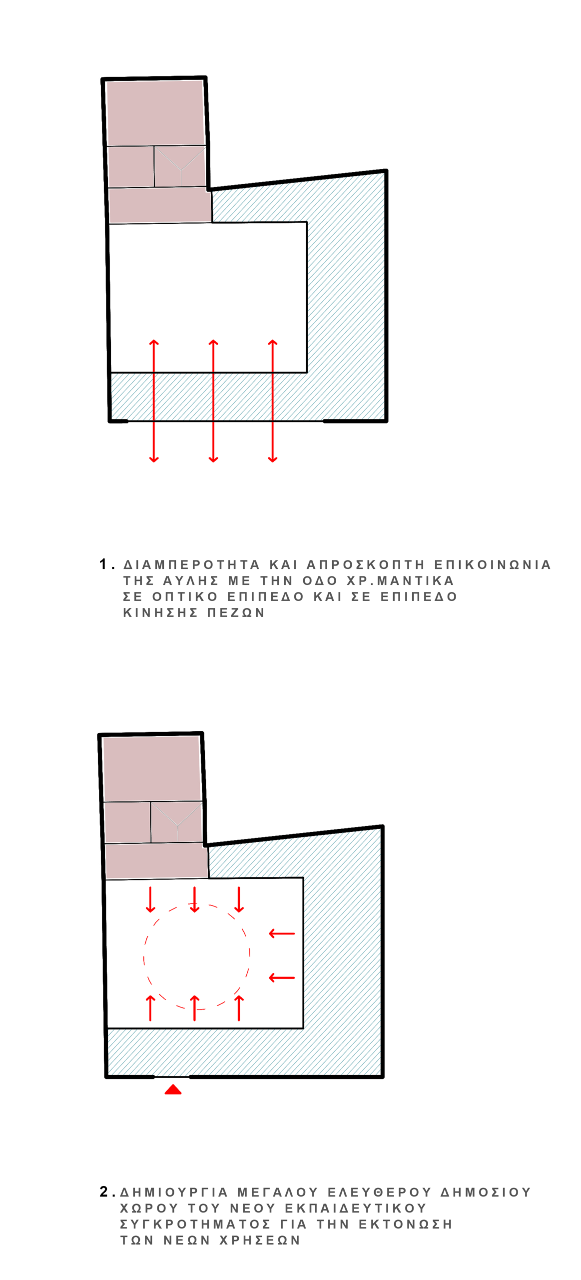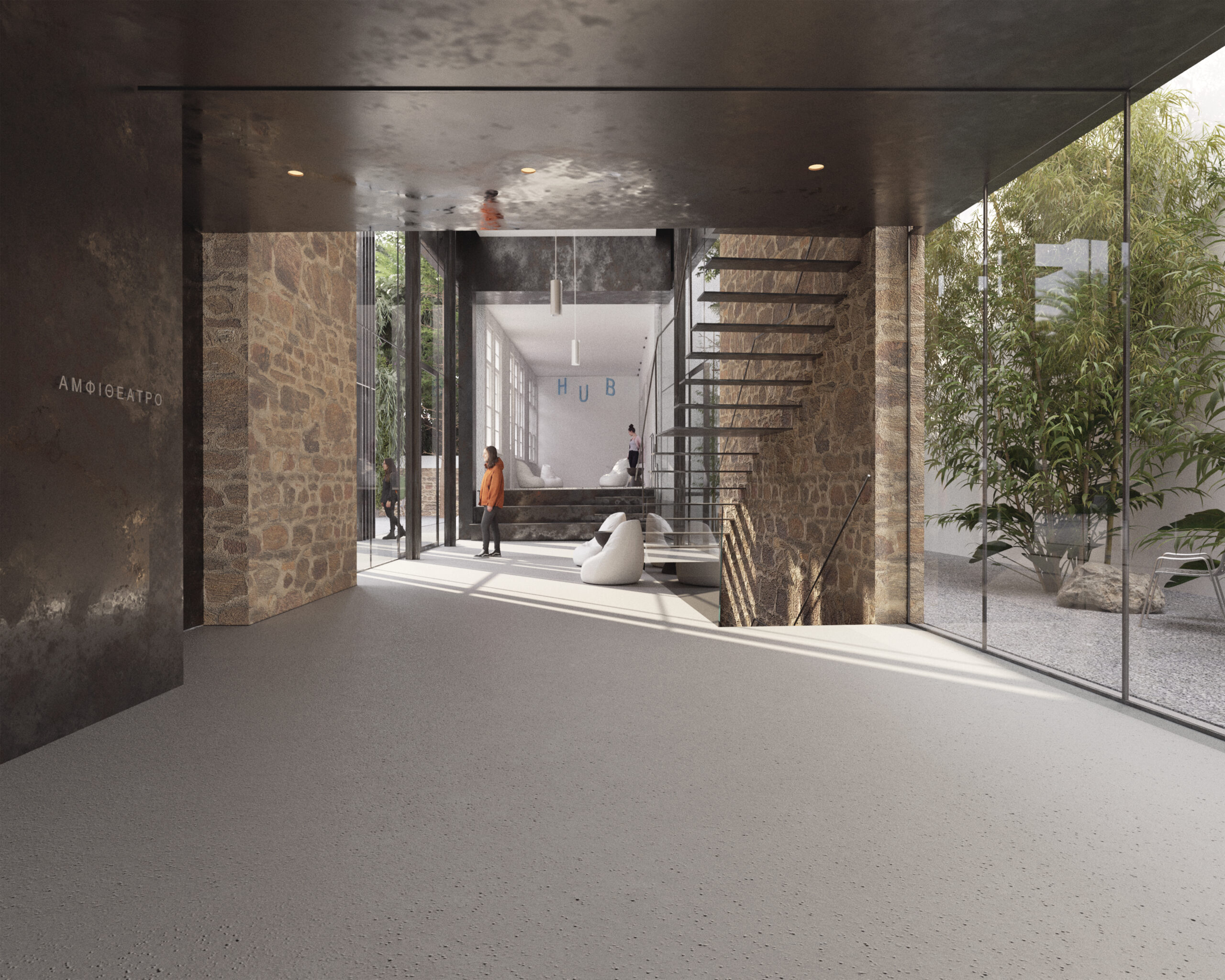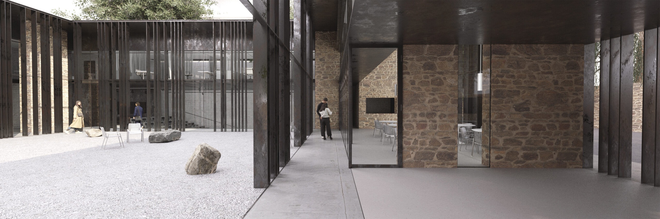 The proposal reimagines the historic Karraideio Building as a contemporary educational complex that actively engages with the urban fabric of Chios. The new addition is organized in a U-shaped layout around a generous central courtyard, conceived as an open civic space for students and the local community. This courtyard becomes the heart of the composition, mediating between public and academic life.