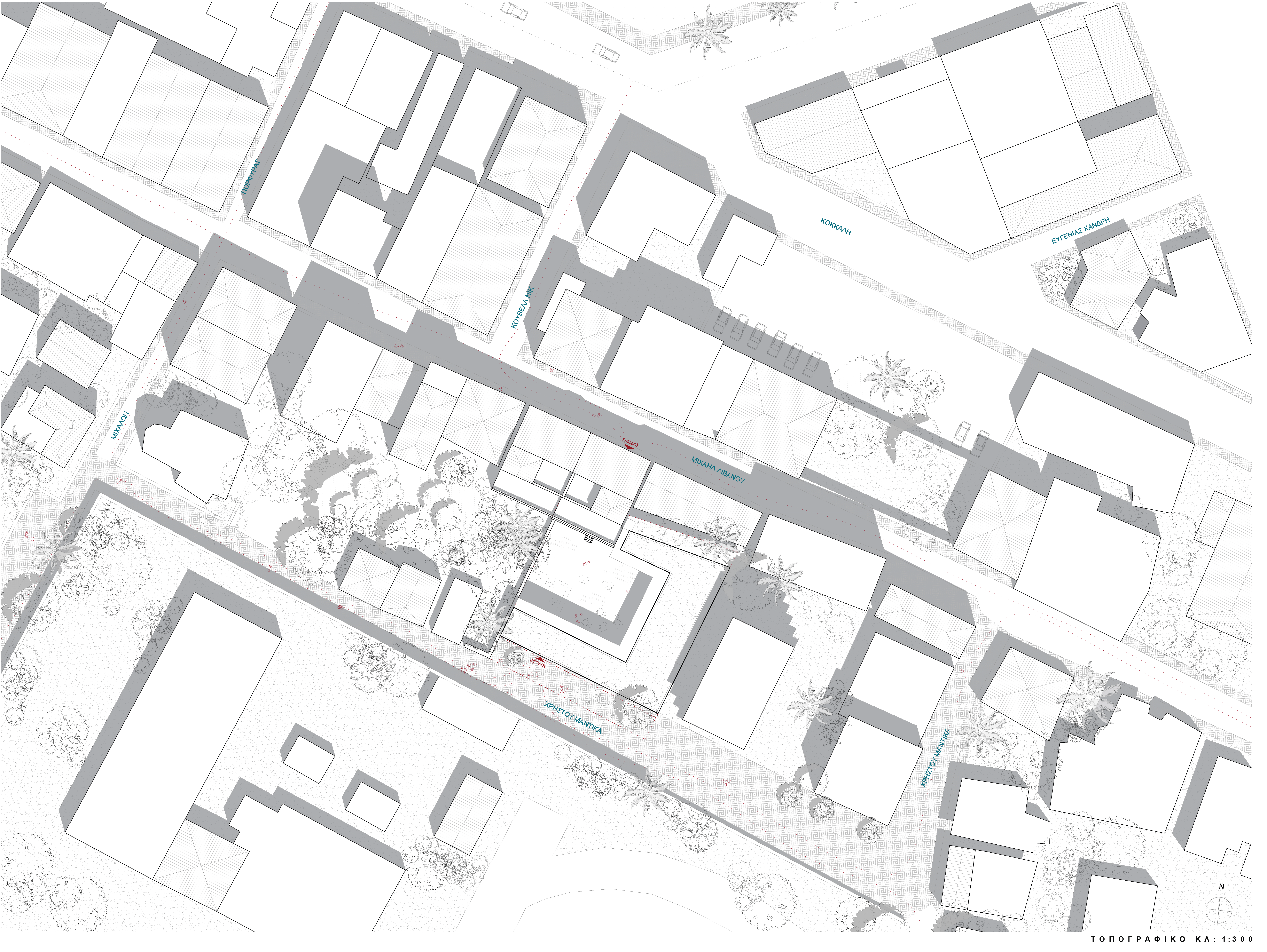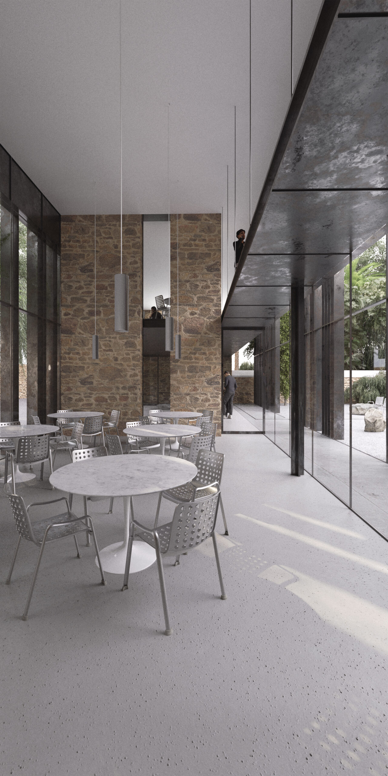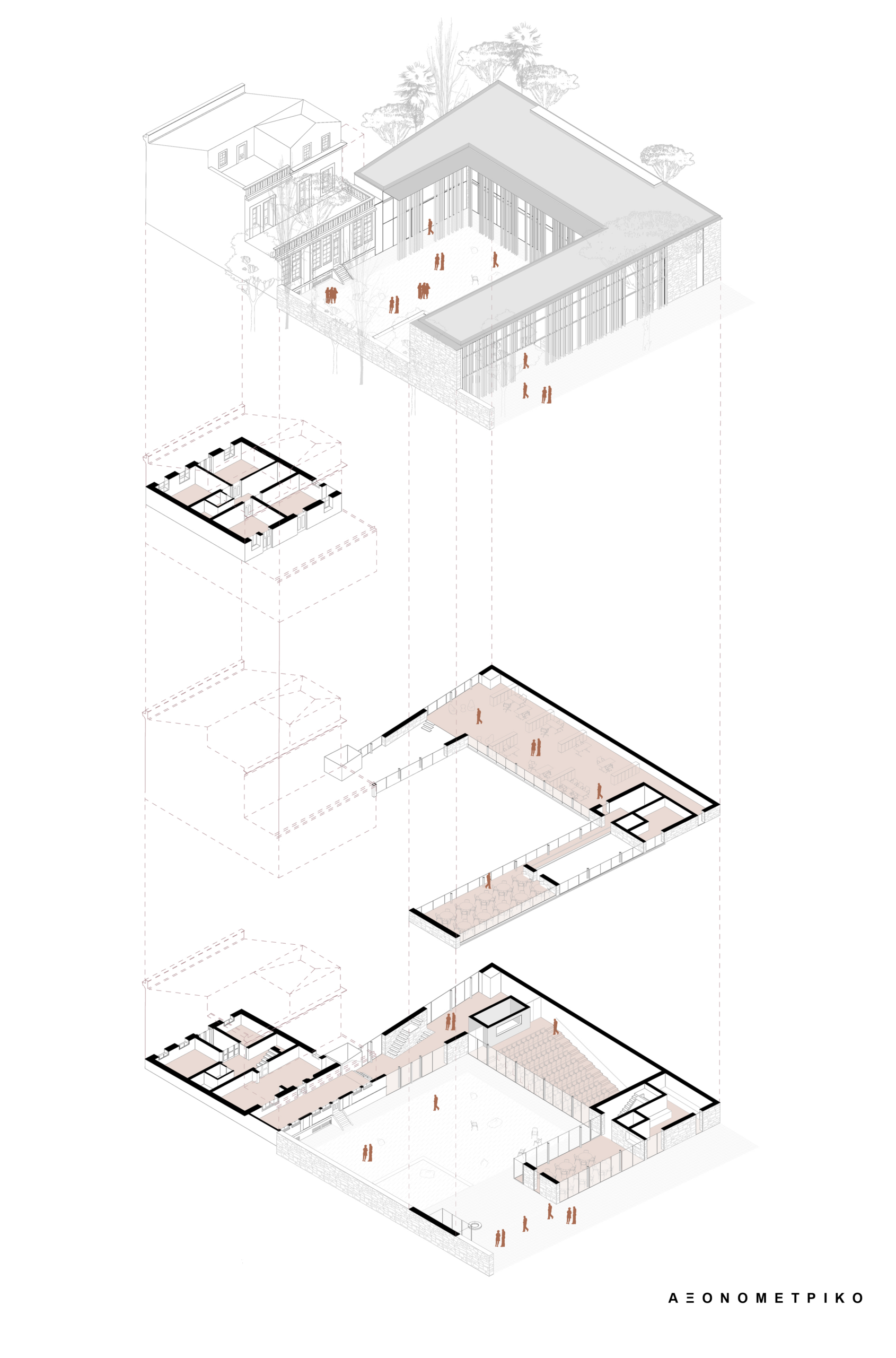 The proposal reimagines the historic Karraideio Building as a contemporary educational complex that actively engages with the urban fabric of Chios. The new addition is organized in a U-shaped layout around a generous central courtyard, conceived as an open civic space for students and the local community. This courtyard becomes the heart of the composition, mediating between public and academic life.
