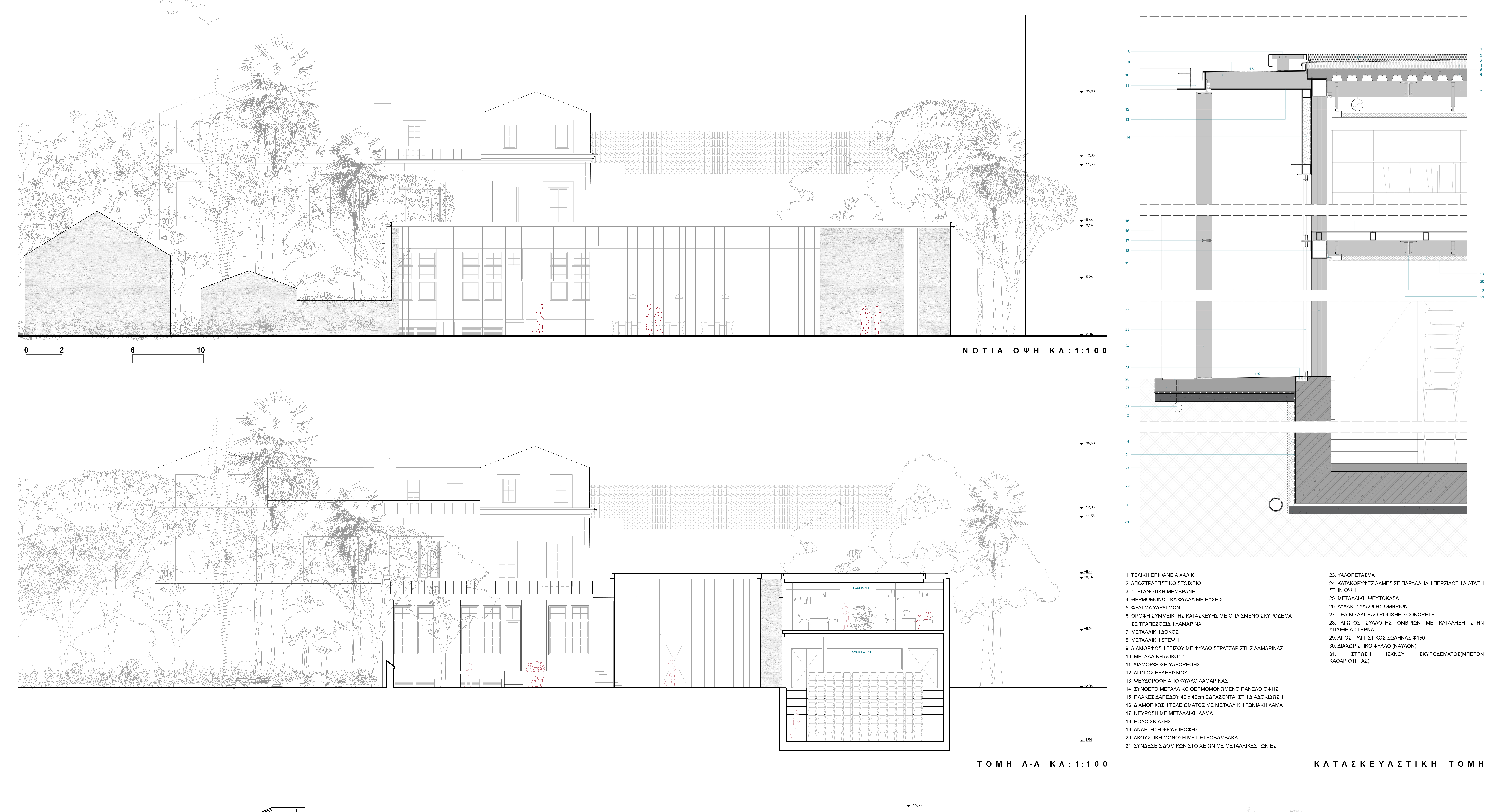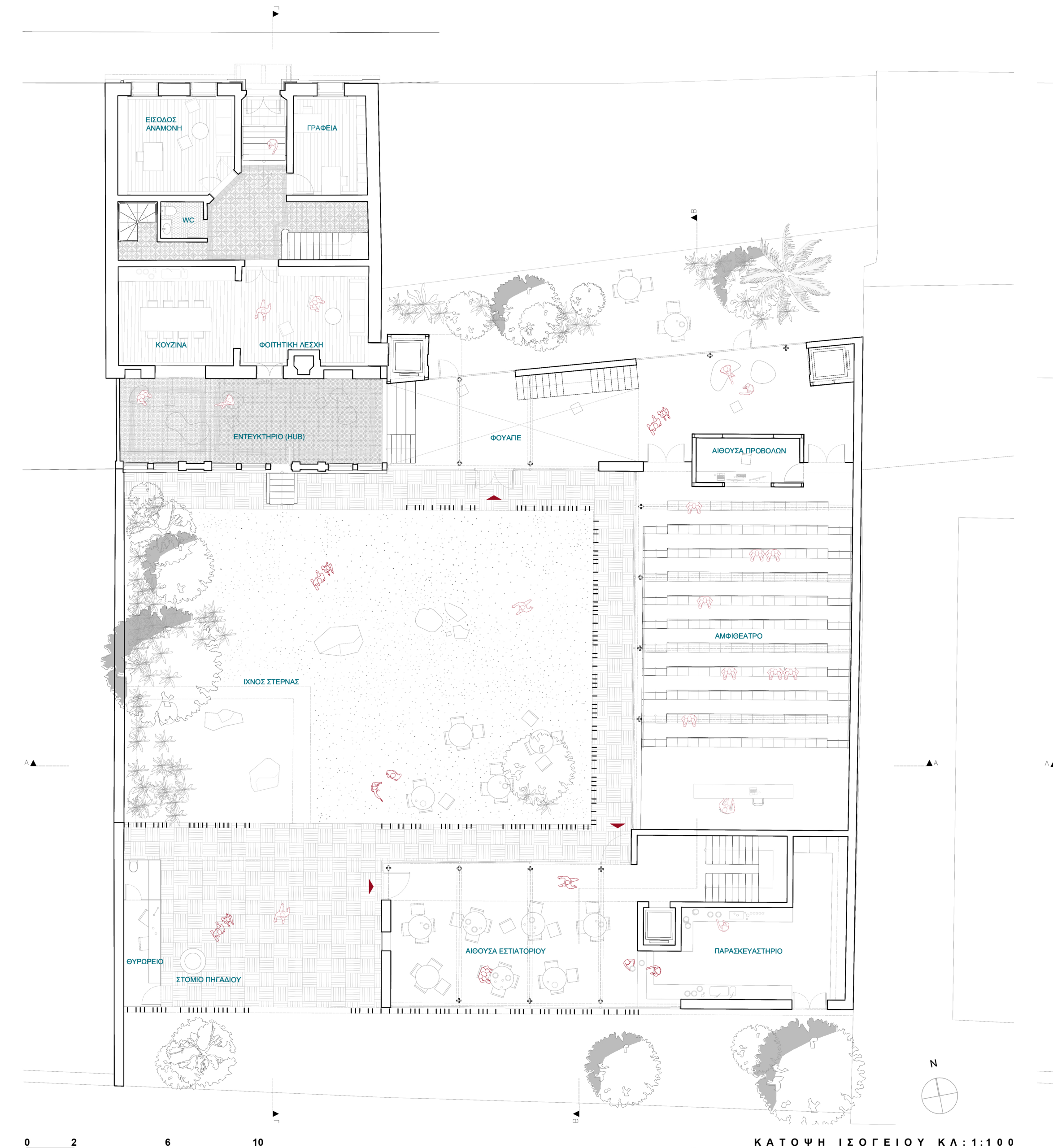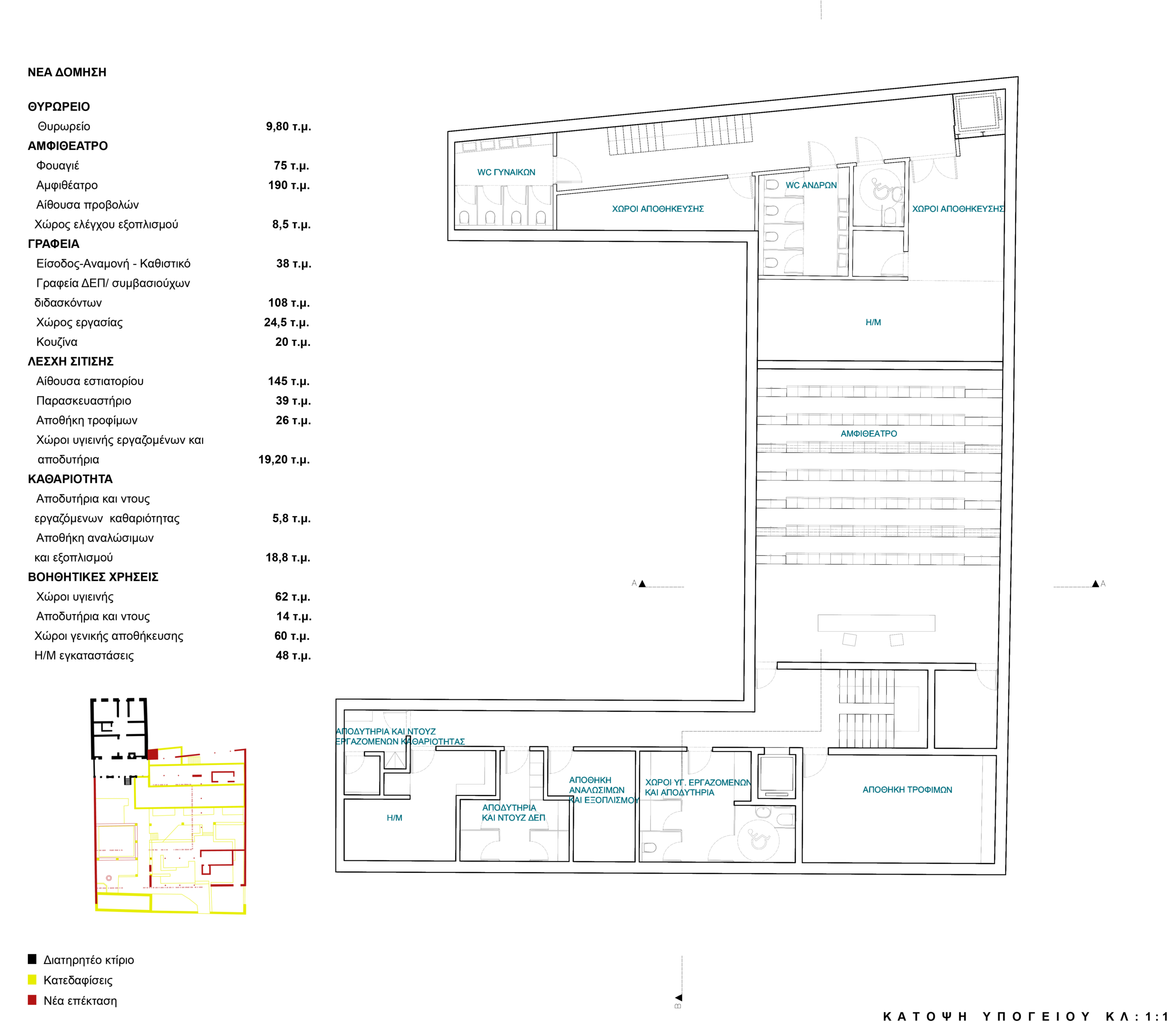 The program is organized around the courtyard. The ground floor hosts the foyer, amphitheater and student dining hall, ensuring direct accessibility and activating the public character of the complex. Faculty offices are located on the upper level of the new wing, while service and mechanical spaces are placed at basement level to maintain clarity and flexibility of the primary spaces.