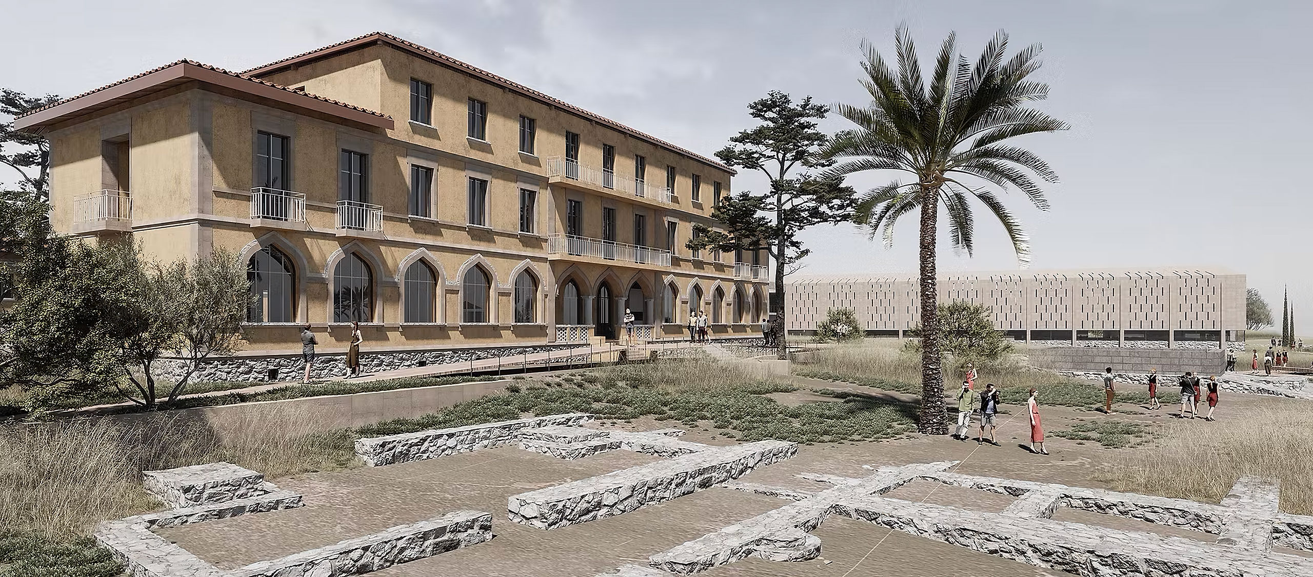 With respect to the preserved building and the ancient Roman baths of the plot, we tried to make the new intervention work as a background to the existing natural and built landscape, enhancing it visually.
